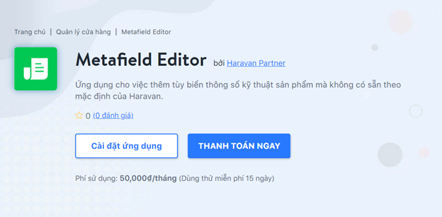 Ứng dụng MetaFields Editor do nhóm Haravan Partners phát triển, hỗ trợ người bán sử dụng với 50,000đ/tháng và được dùng thử trong 15 ngày.