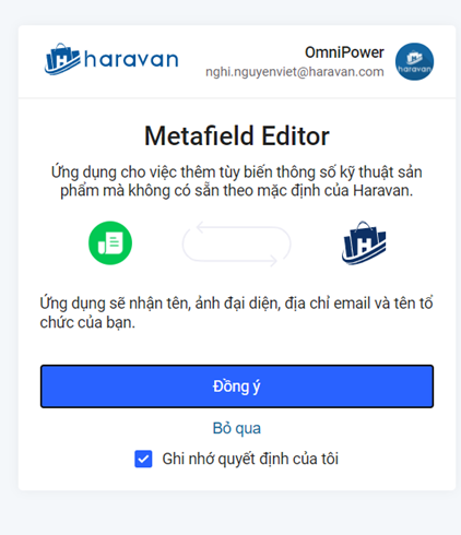 Hệ thống điều hướng về Trang quản trị Haravan. Tại đây, người bán chọn "Đồng ý" hai lần liên tiếp.