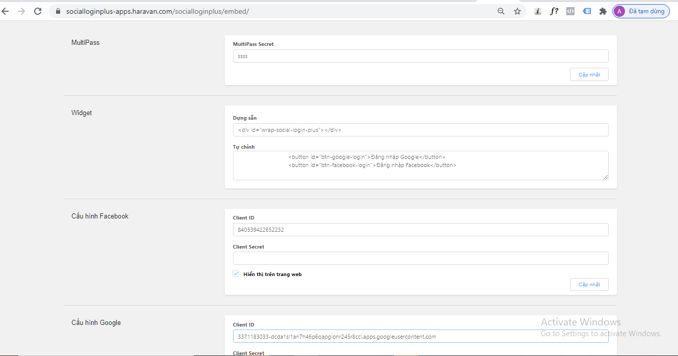 Tại lần đầu tiên đăng nhập vào ứng dụng, hệ thống sẽ tự động cấu hình Client ID và Client Secret theo Haravan (dành cho cả Cấu hình Facebook và Cấu hình Google). Lúc này Nhà bán hàng có thể không cần cấu hình lại Client ID và Client Secret, chỉ cần thực hiện thao tác gắn đoạn mã tại widget vào vị trí mong muốn trên web theme.
