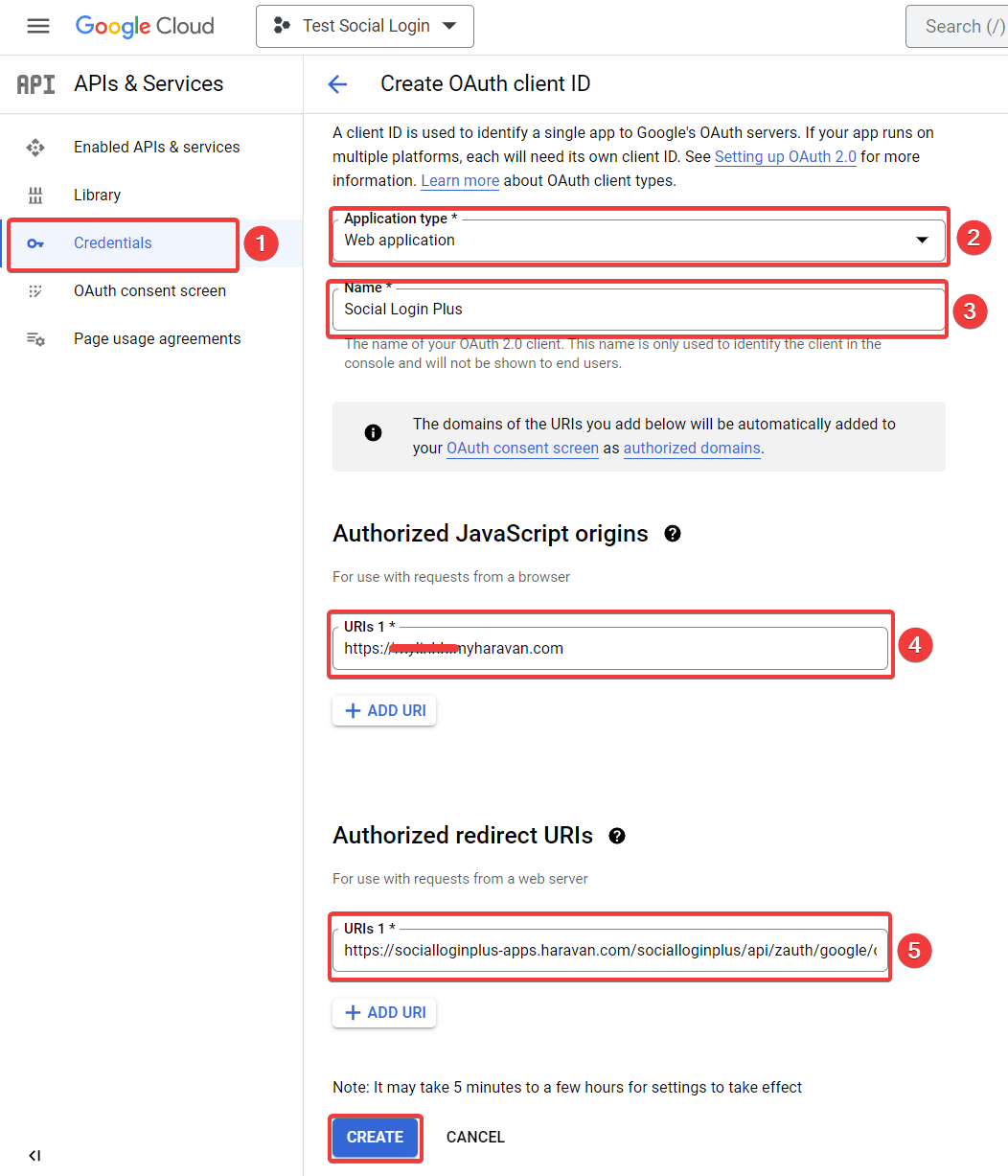 - Authorized redirect URls: nhập URL callback của ứng dụng. (Link URL: https://socialloginplus-apps.haravan.com/socialloginplus/api/zauth/google/callback)
