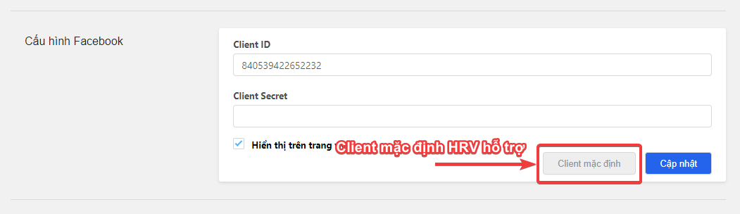 Trường hợp Nhà bán hàng muốn sử dụng Client ID và Client Secret mặc định do Haravan hỗ trợ, hãy nhấn chọn vào nút Client mặc định