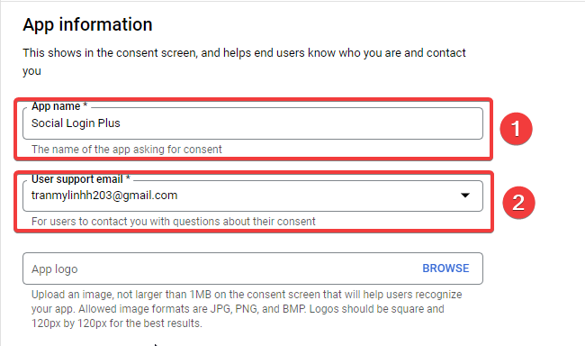 Bước 5.2: Nhập App name là Social Login Plus, nhập User support email để khách hàng có thể liên hệ bạn khi có thắc mắc