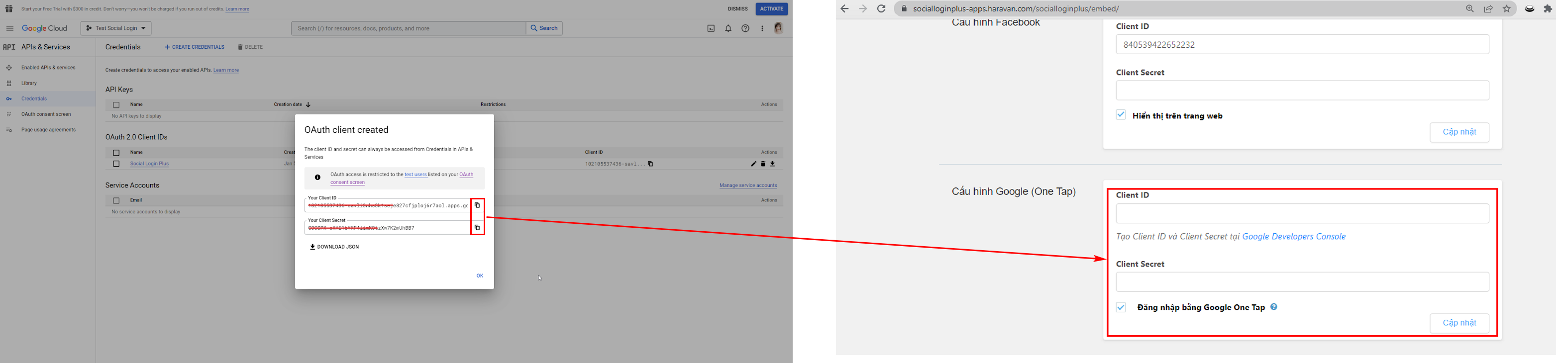 Bước 7: Lúc này Google đã tạo cho bạn một Client ID và Client Secret -> Copy 2 dãy Client ID và Client Secret và dán vào trong Cấu hình Google (One Tap) tại ứng dụng Social Login Plus -> Chọn Cập nhật để hoàn tất