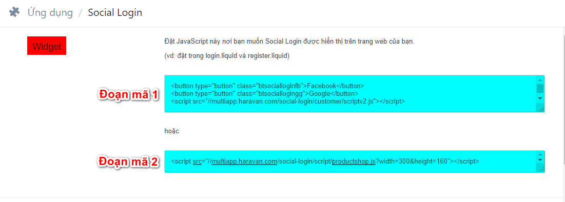 Lưu ý: Nhà bán hàng chỉ cần dán một trong hai đoạn mã trong mục Widget. Haravan khuyến cáo Nhà bán hàng lựa chọn đoạn mã 1 được đánh giá là mã hóa tốt hơn.