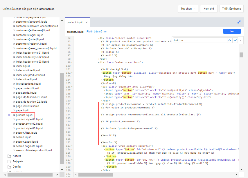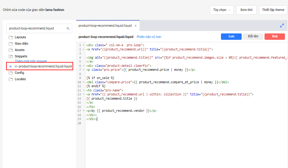 Sau khi tạo mới tệp product-loop-recommend.liquid, Nhà bán hàng sao chép và dán đoạn mã sau vào trong tệp. Nhấn Lưu để hoàn tất.