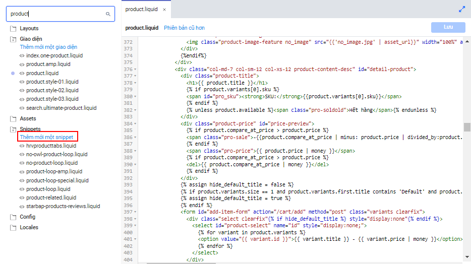 - Nhà bán hàng tìm kiếm tệp product.liquid, sau đóNhà bán hàng sao chép đoạn mã bên dưới và dán vào tệp product.liquid. Nhấn Lưu để hoàn tất.
