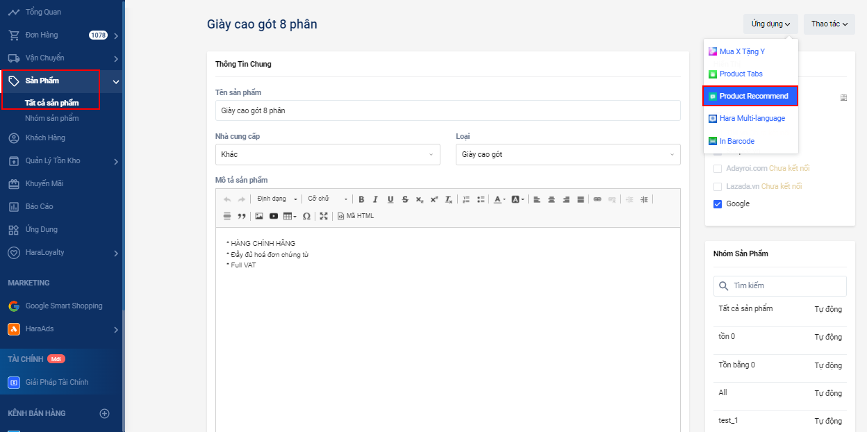 Trong trang chi tiết sản phẩm của sản phẩm đó, Nhà bán hàng nhấp chọn Ứng dụng -> Product Recommend
