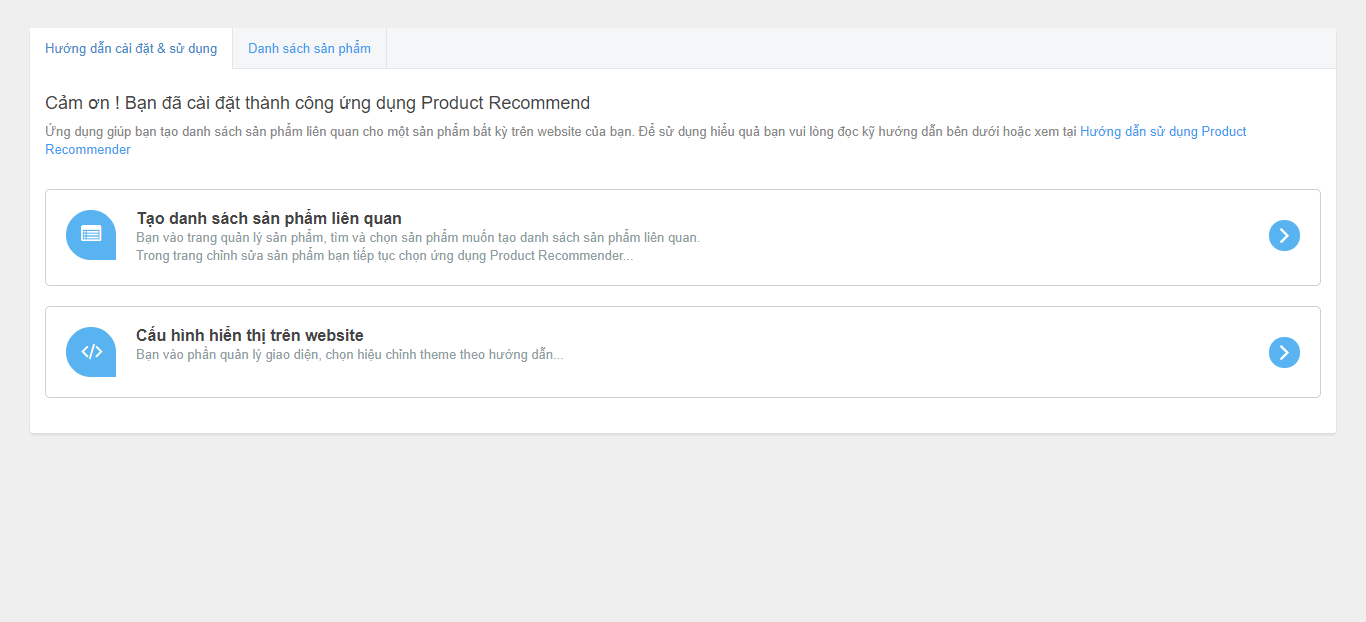 Product Recommend là ứng dụng bán hàng được cung cấp hoàn toàn miễn phí cho Nhà bán hàng nhằm đáp ứng nhu cầu tạo danh sách sản phẩm liên quan.