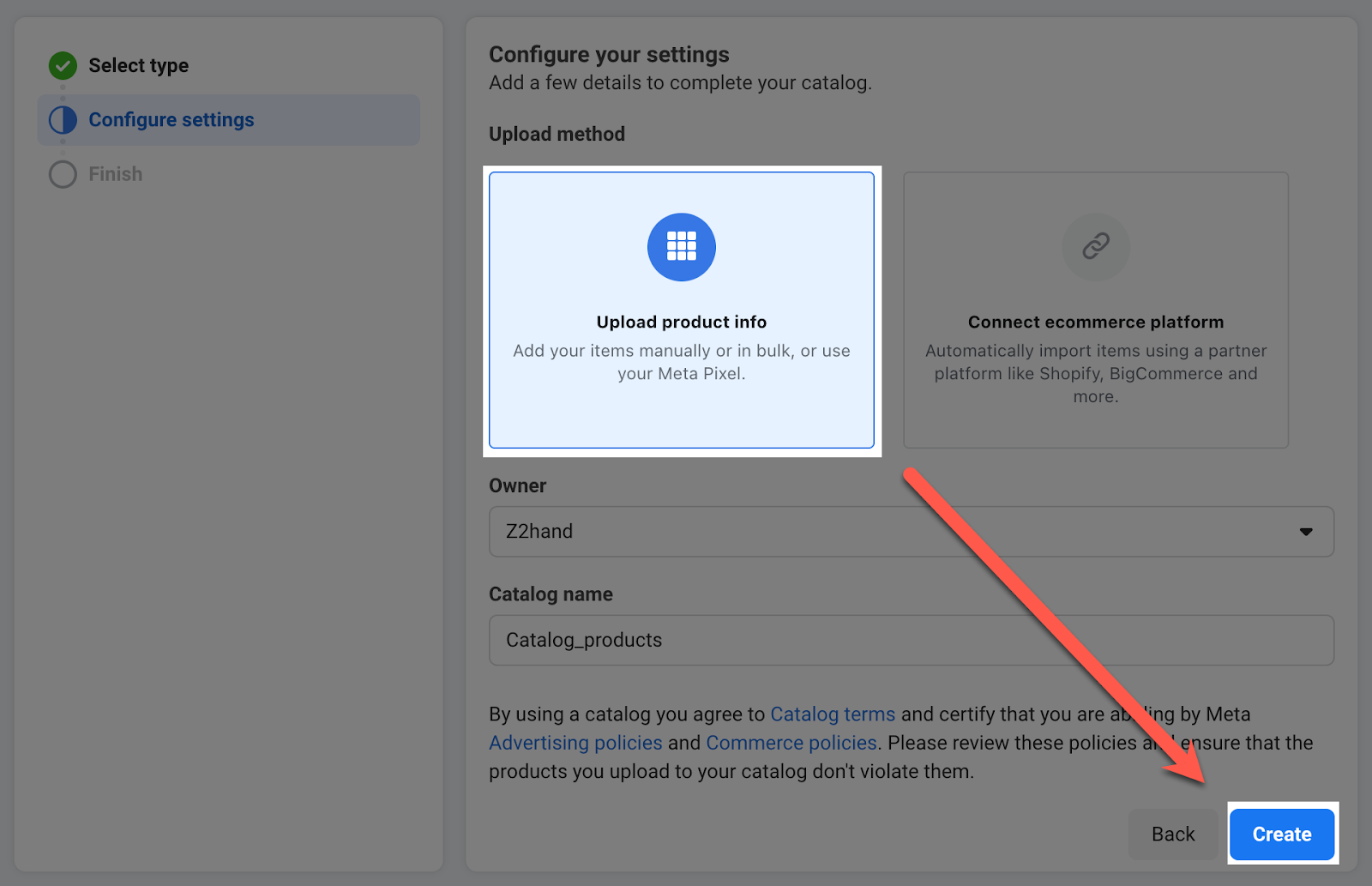 Bước 3: Chọn Upload Product Info, nhập/chọn thông tin Owner (bạn có thể giữ nguyên mặc định) và đặt tên cho danh mục ở phần Catalog Name. Cuối cùng là nhấn Create để tạo danh mục.