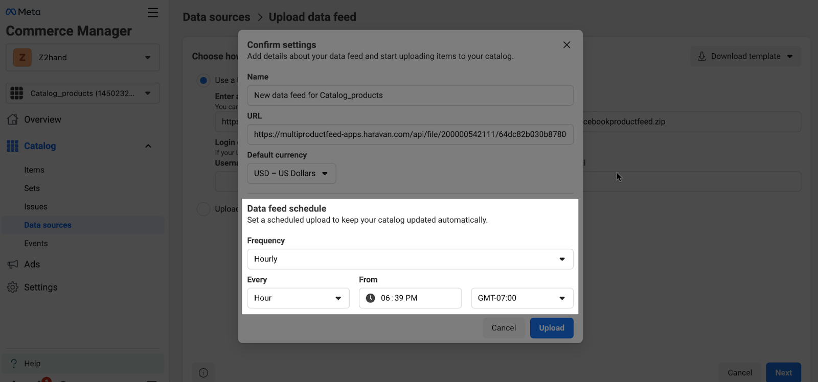 Bước 4: Chọn khoảng thời gian bạn muốn Meta cập nhật lại nguồn cấp dữ liệu của mình và nhấn Upload.