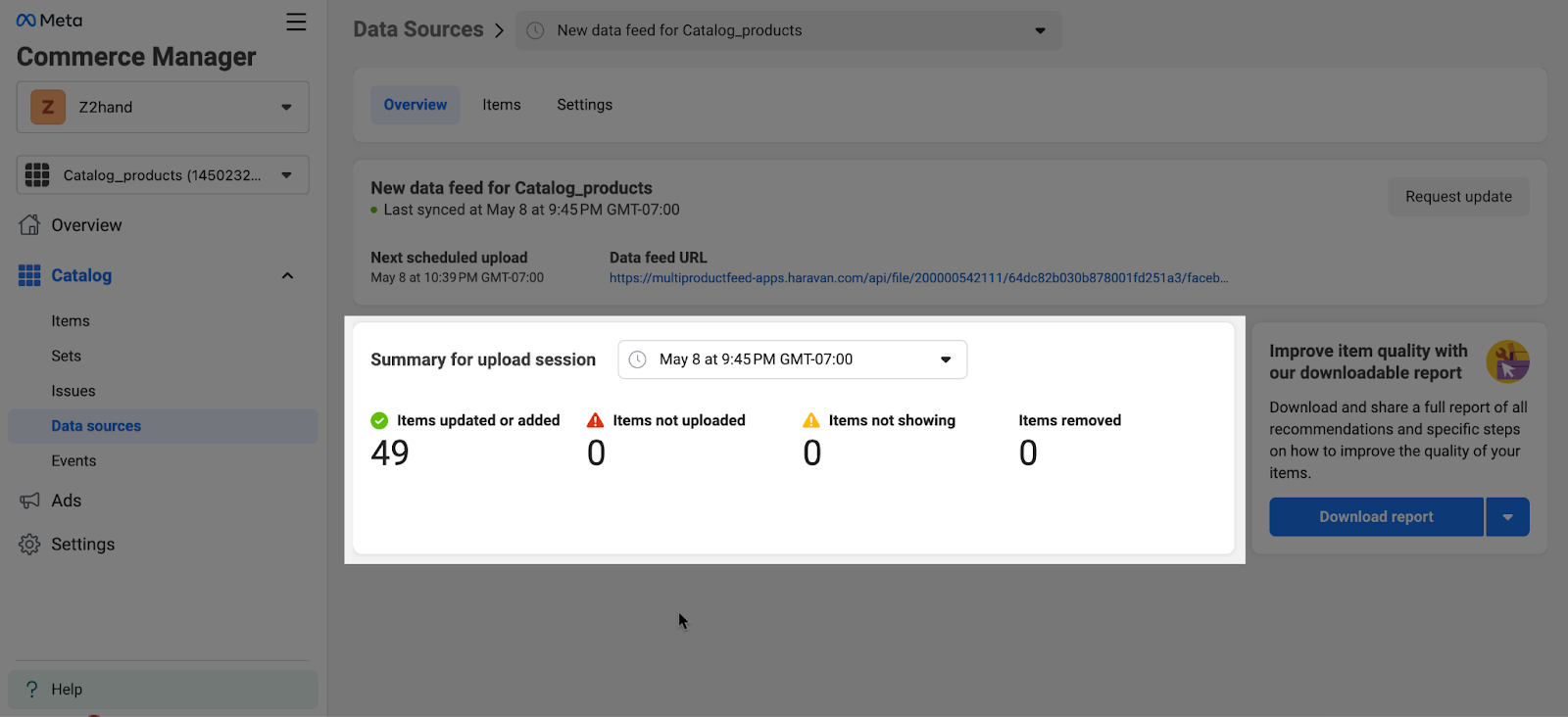 Sau khi tiến hành xác nhận tải lên nguồn cấp dữ liệu, Meta sẽ thực hiện quá trình đăng tải nguồn cấp từ Haravan lên Facebook. Khi hoàn tất đăng tải, Meta sẽ liệt kê các thông tin liên quan đến nguồn cấp bao gồm thông tin:
