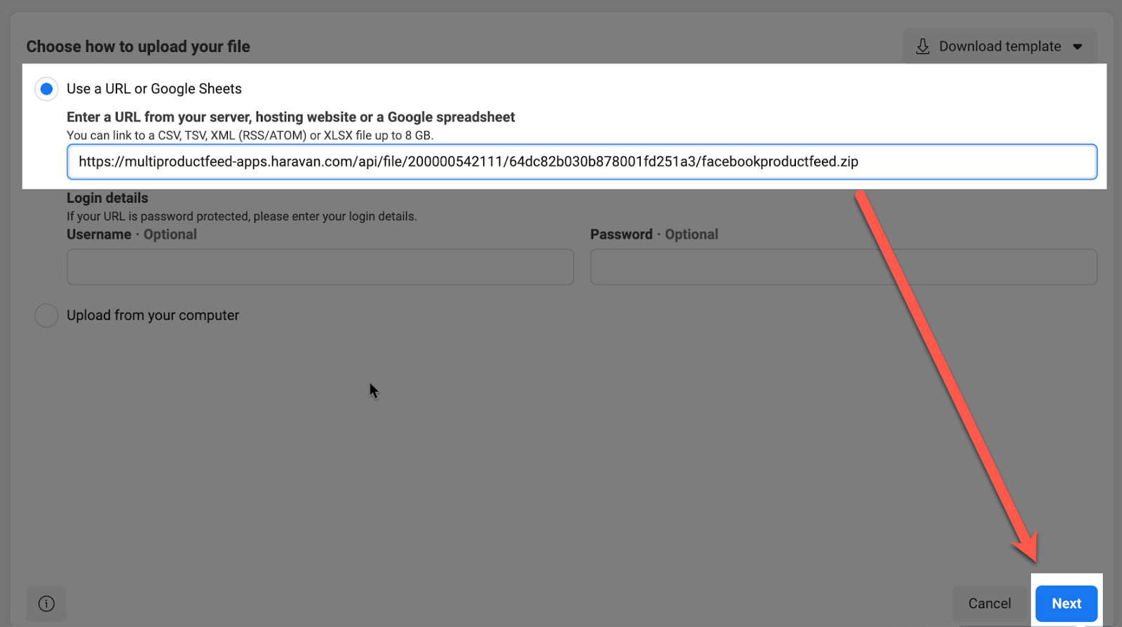 Bước 3: Tại danh mục (catalog), hãy dán link vừa sao ch**ép vào ô nhập** và nhấn Next.