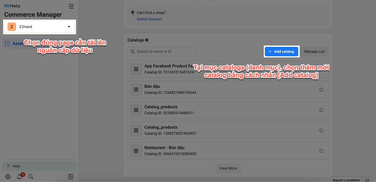Bước 1: Bạn cần đăng nhập vào Commerce Manager và chọn đúng trang cần tải lên dữ liệu nguồn cấp sản phẩm. Sau đó, trong mục Catalogs, bạn chọnAdd catalog (hoặc Thêm danh mục) để tạo mới một danh mục.