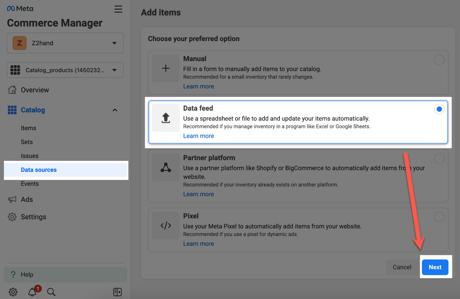Bước 1: Tại danh mục (catalog) vừa tạo, hãy nhấn vào Data sources và lựa chọn Data feed, nhấn Next.