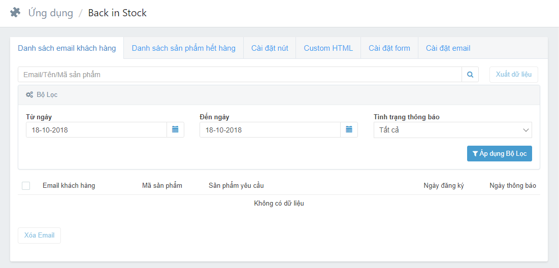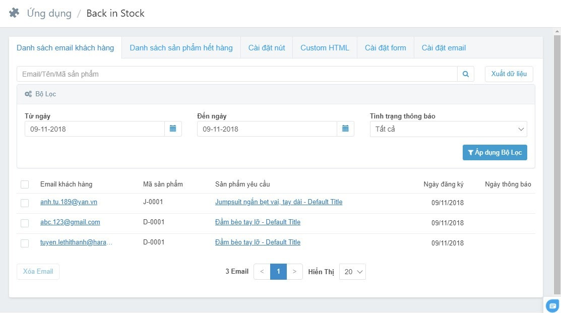 Thông tin email đăng ký của Khách mua hàng được chuyển về tab Danh sách email khách hàng trong ứng dụng Back in Stock.