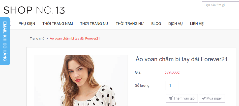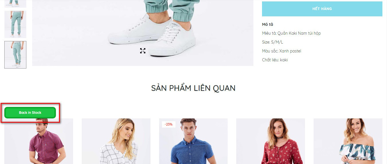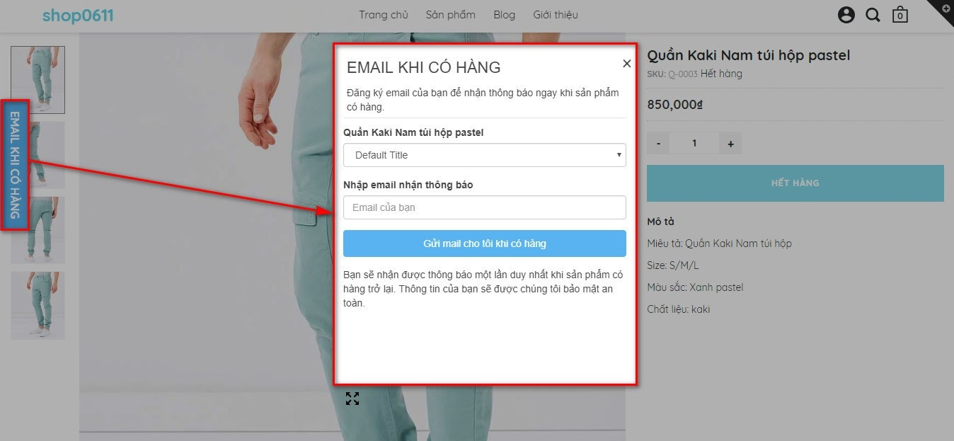 Lúc này, khi khách mua hàng truy cập vào trang chi tiết của sản phẩm sẽ nhìn thấy được nút đăng ký nhận email khi có hàng lại.