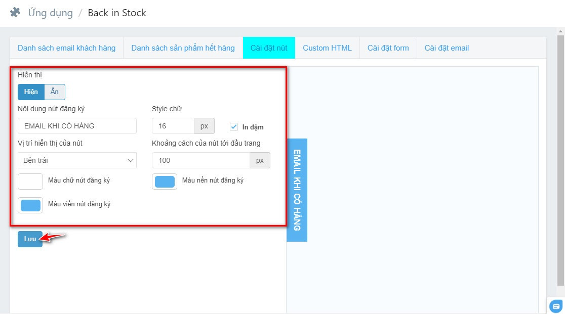 Để tạo và kích hoạt nút này, người bán truy cập vào ứng dụng Back in Stock, chọn tab Cài đặt nút.