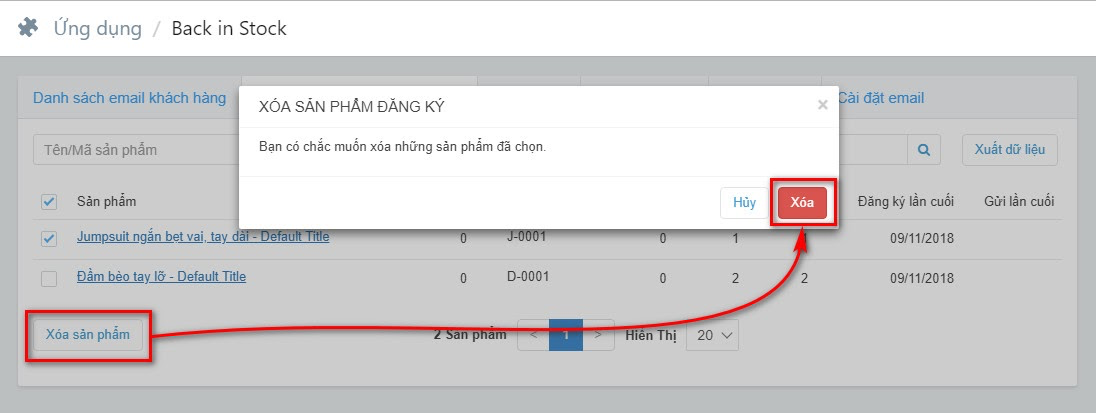 Xóa sản phẩm: sau khi xóa sản phẩm, những Khách mua hàng đăng ký nhận sản phẩm sẽ không nhận email thông báo khi có hàng lại.