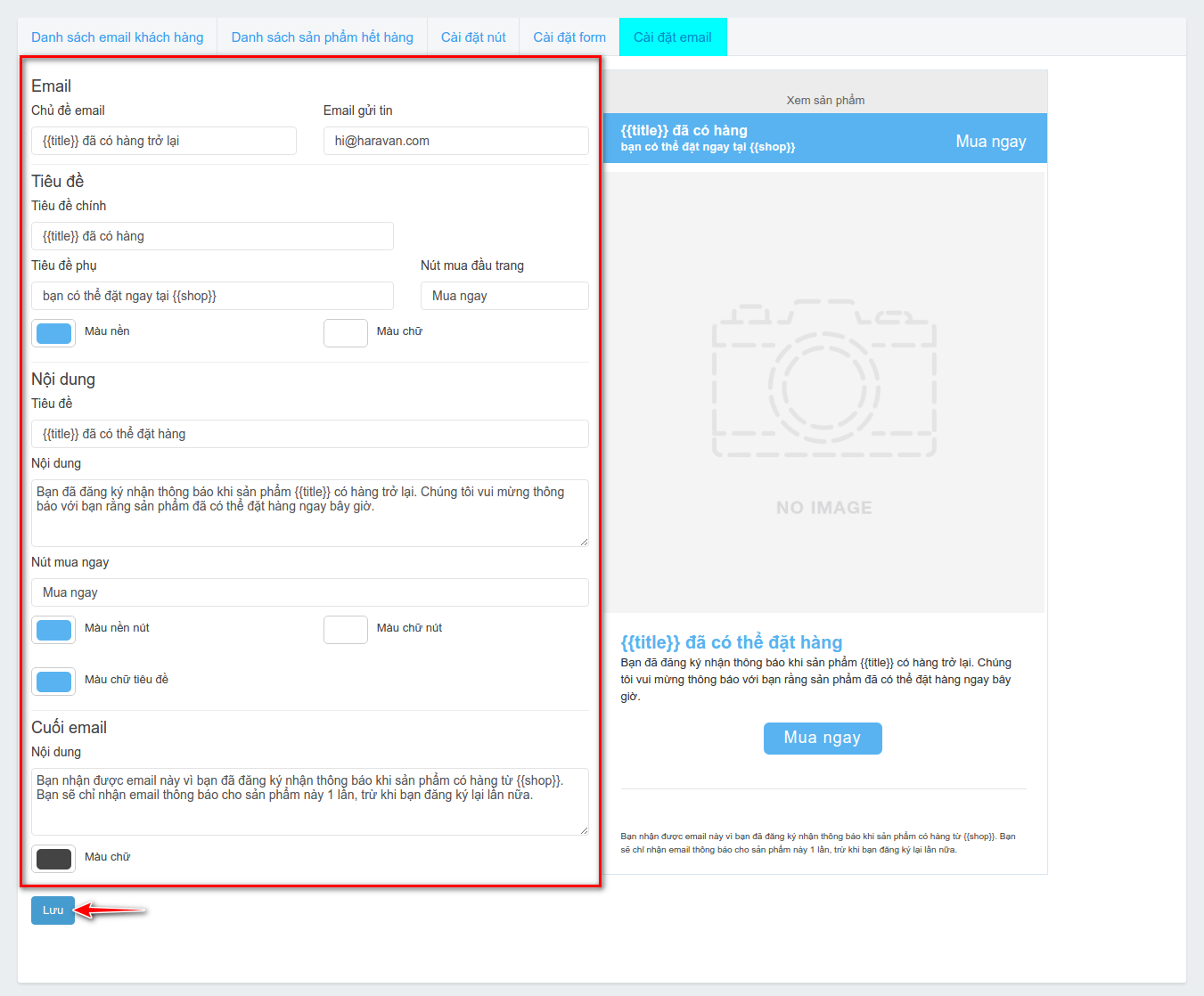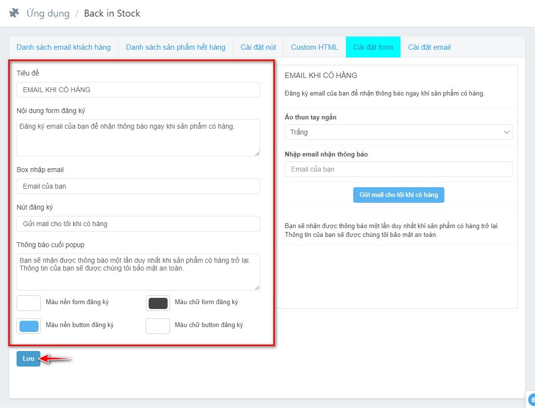 Người bán vào trong tab Cài đặt form của ứng dụng Back in Stock để thiết lập cho mẫu form đăng ký nhận email.