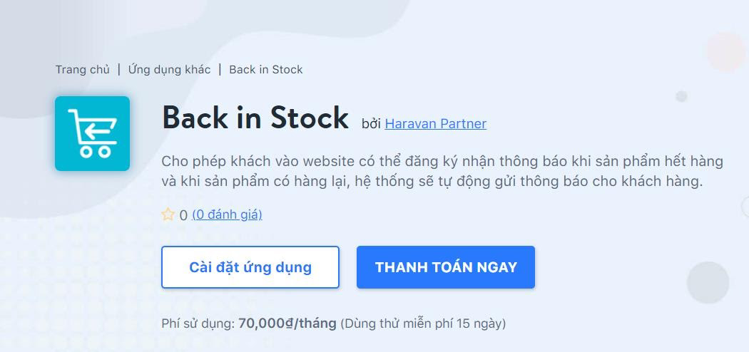 Ứng dụng Back in Stock do nhóm Haravan Partners phát triển, hỗ trợ người bán dùng thử 15 ngày, trước khi sử dụng chính thức với mức phí 70,000đ/tháng.