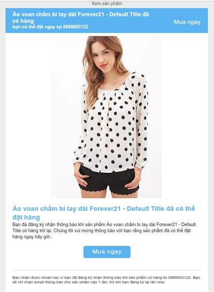 Một khi ứng dụng Back in Stock, khách mua hàng có thể đăng ký nhận email thông báo khi sản phẩm có hàng lại và khi sản phẩm có hàng lại, hệ thống sẽ tự động gửi thông báo cho khách hàng, kèm nút mua hàng.