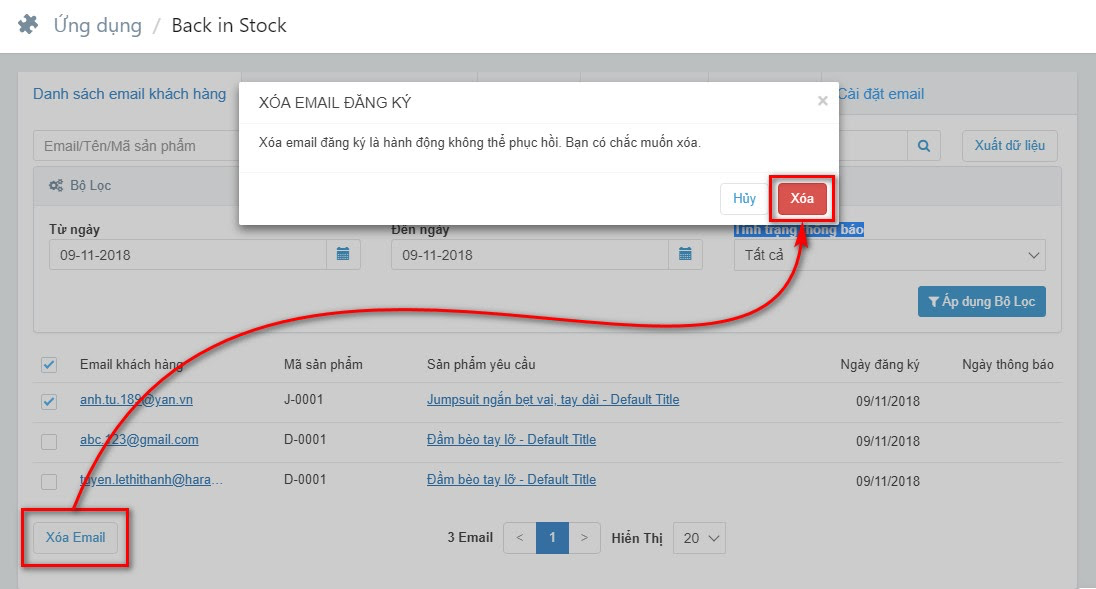 Hành động xóa email khách hàng và xóa sản phẩm có tác động qua lại giữa hai danh sách. Hành động xóa không thể hoàn tác hay phục hồi dữ liệu, do đó người bán cân nhắc khi thực hiện.