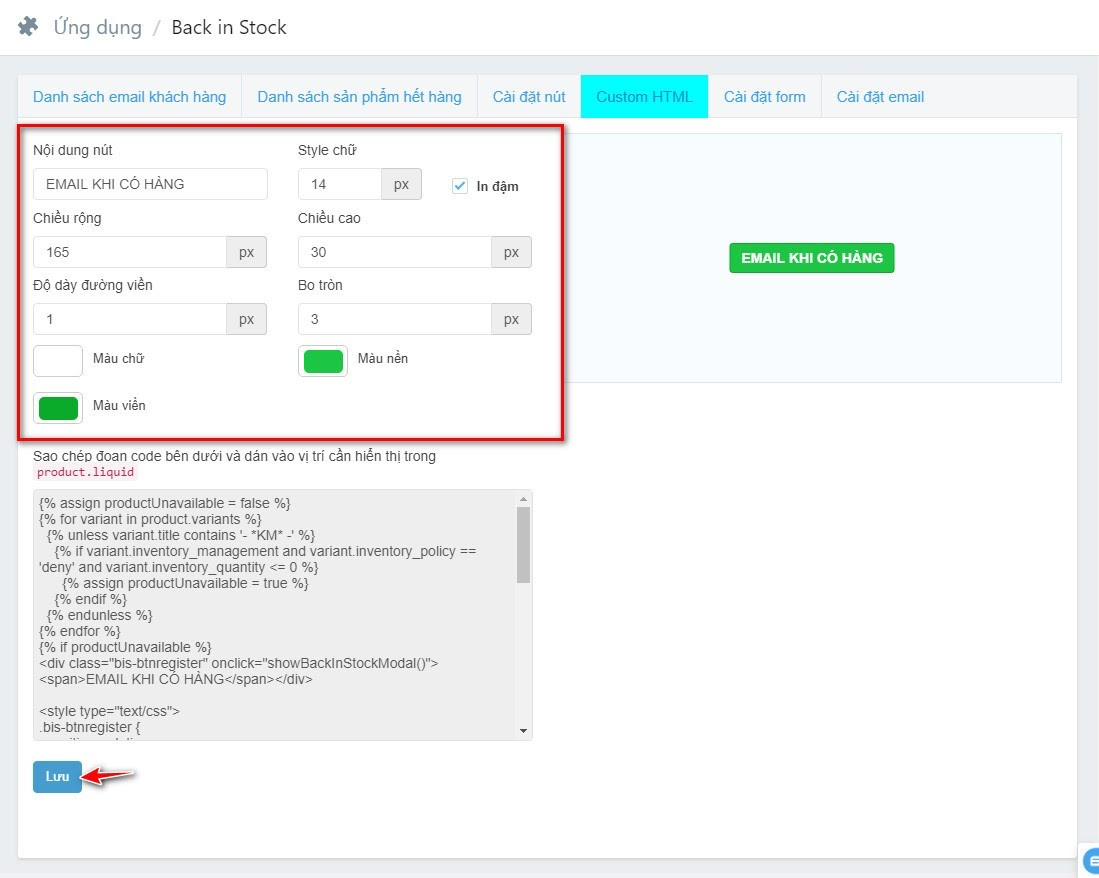 Trong ứng dụng Back in Stock, người bán chọn tab Custom HTML.