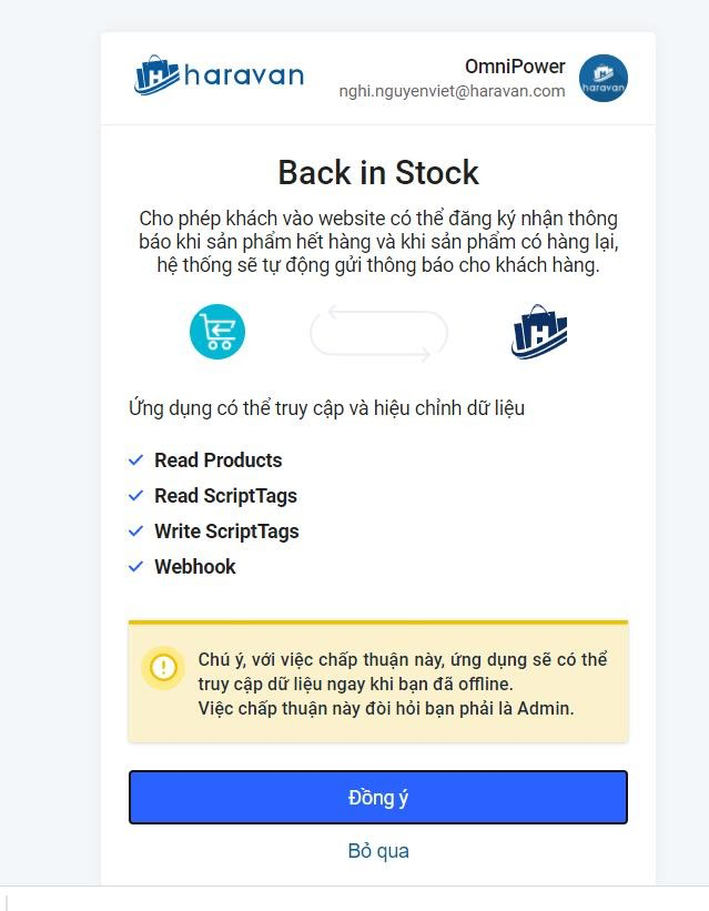 Hệ thống điều hướng về Trang quản trị Haravan. Tại đây, người bán bấm "Đồng ý" hai lần liên tiếp.