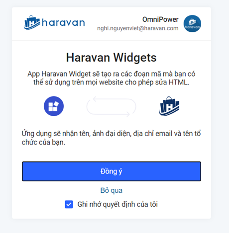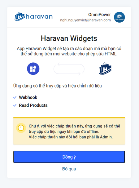 - Hệ thống điều hướng về Trang quản trị Haravan. Tại đây, người bán chọn "Đồng ý" hai lần liên tiếp.