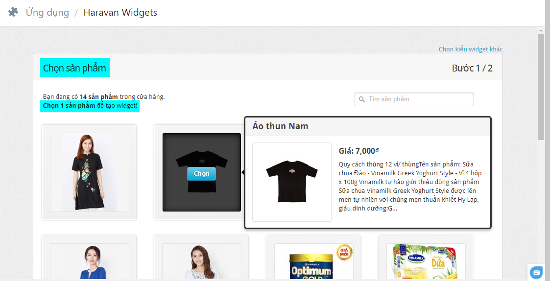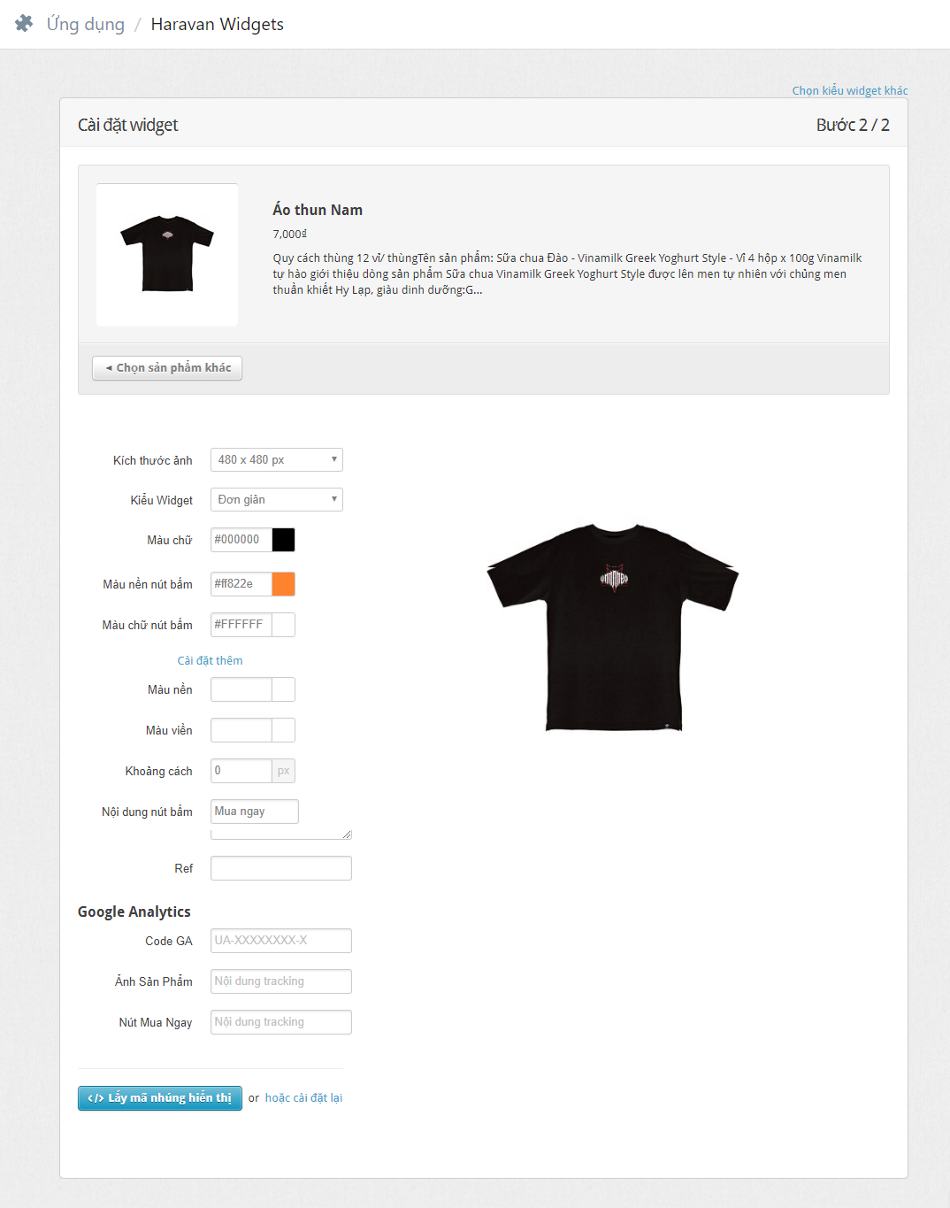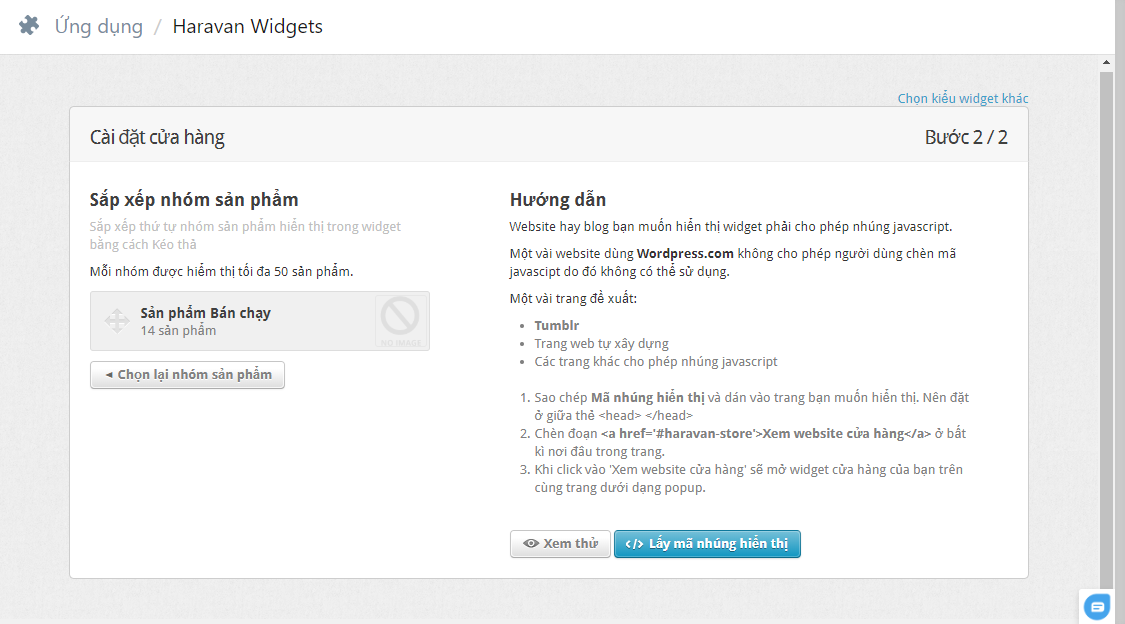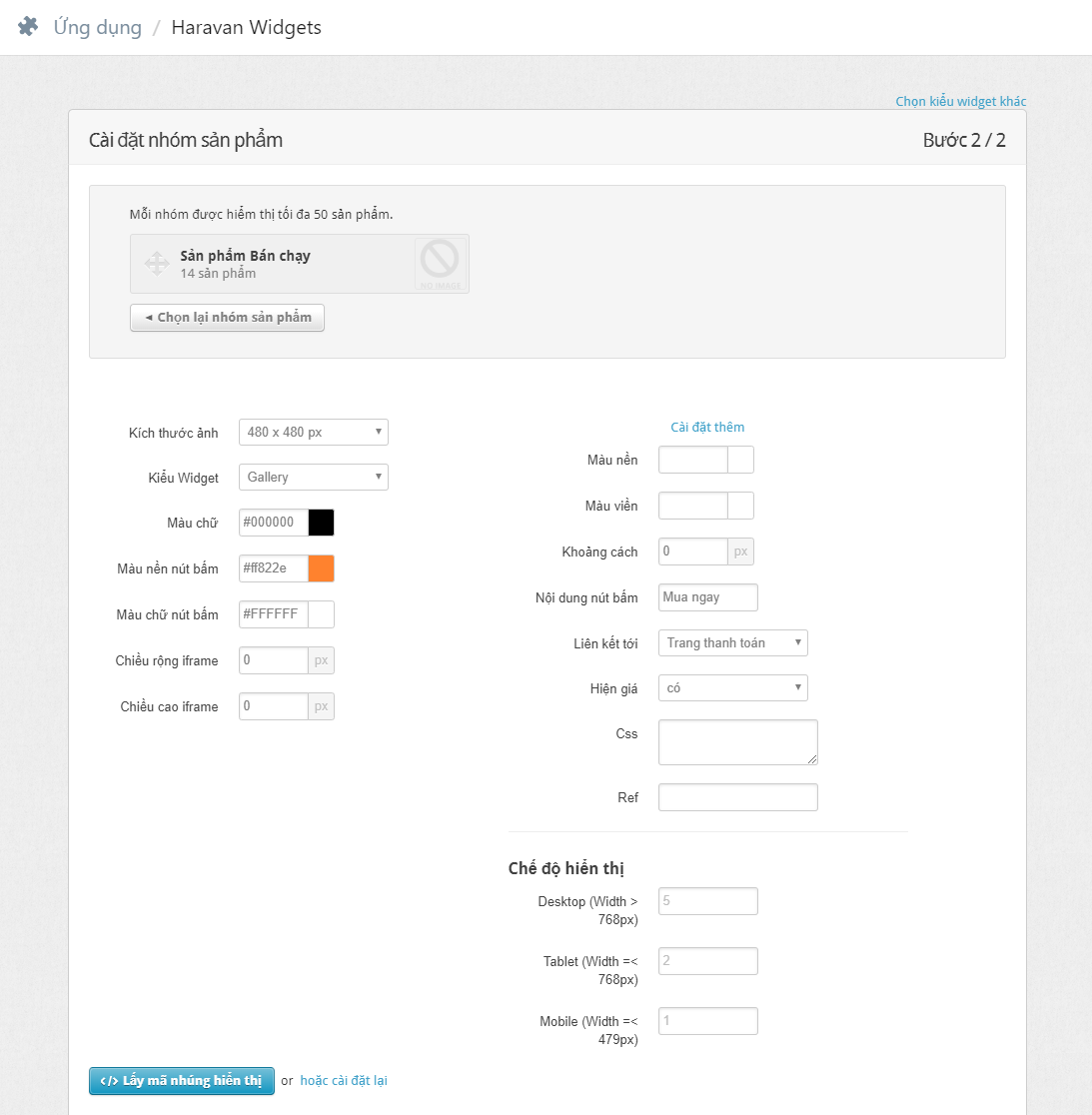 Sau khi chọn một sản phẩm, hệ thống chuyển đến trang Cài đặt Widget để cấu hình.