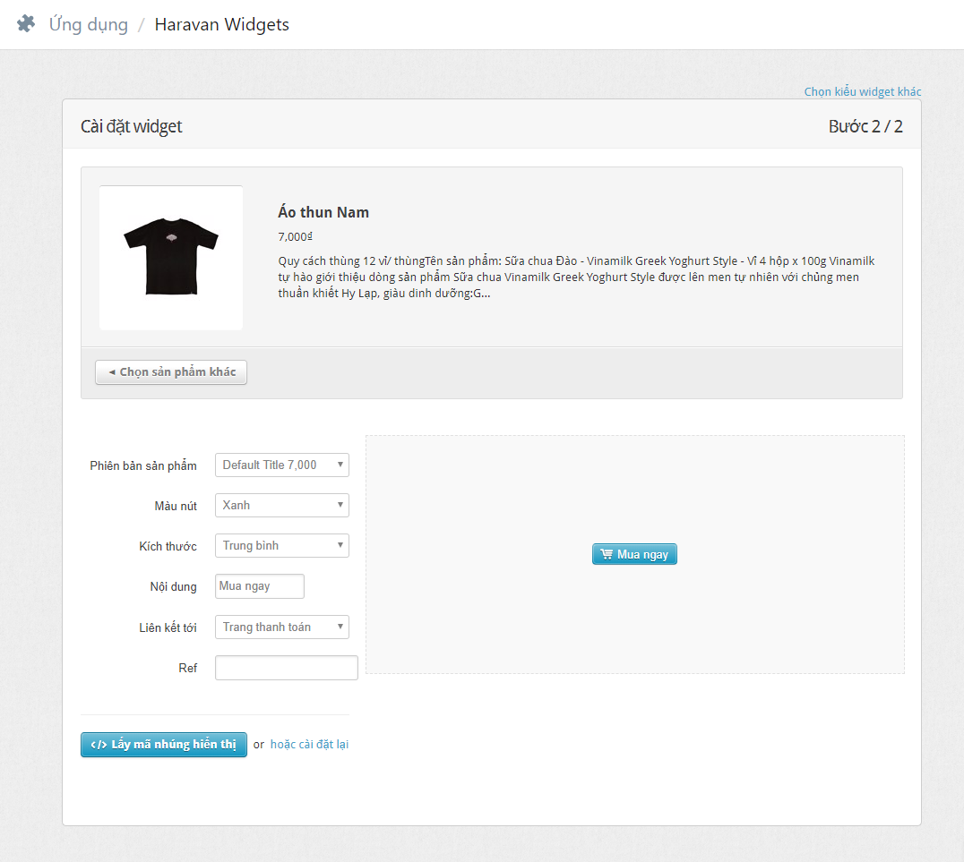Sau khi chọn một sản phẩm, hệ thống chuyển đến trang Cài đặt Widget để cấu hình Nút Mua ngay.