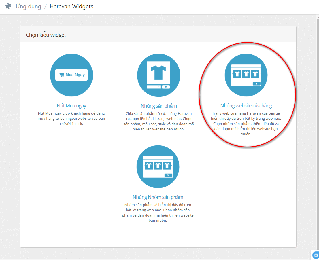 - Trên trang ứng dụng Widgets, chọn Nhúng website cửa hàng.