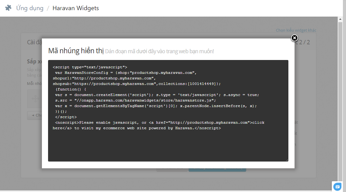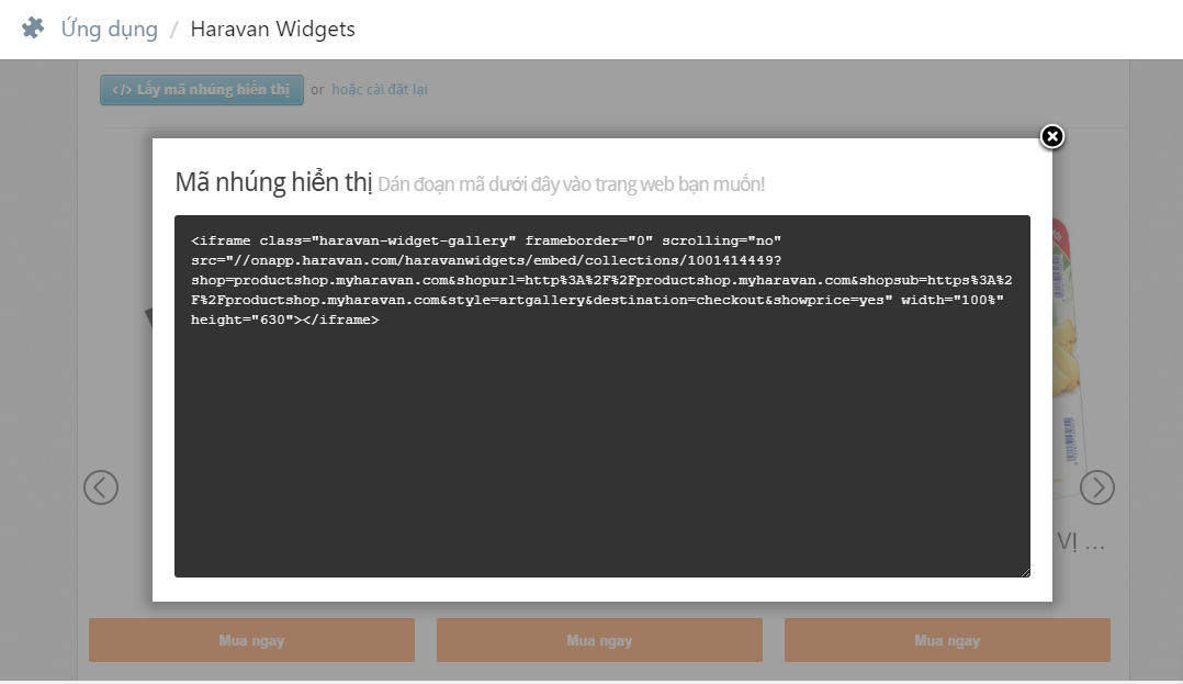 Sau khi hoàn tất cài đặt widget, người bán chọn vào nút Lấy mã nhúng hiển thị. Màn hình hiển thị đoạn mã nhúng.