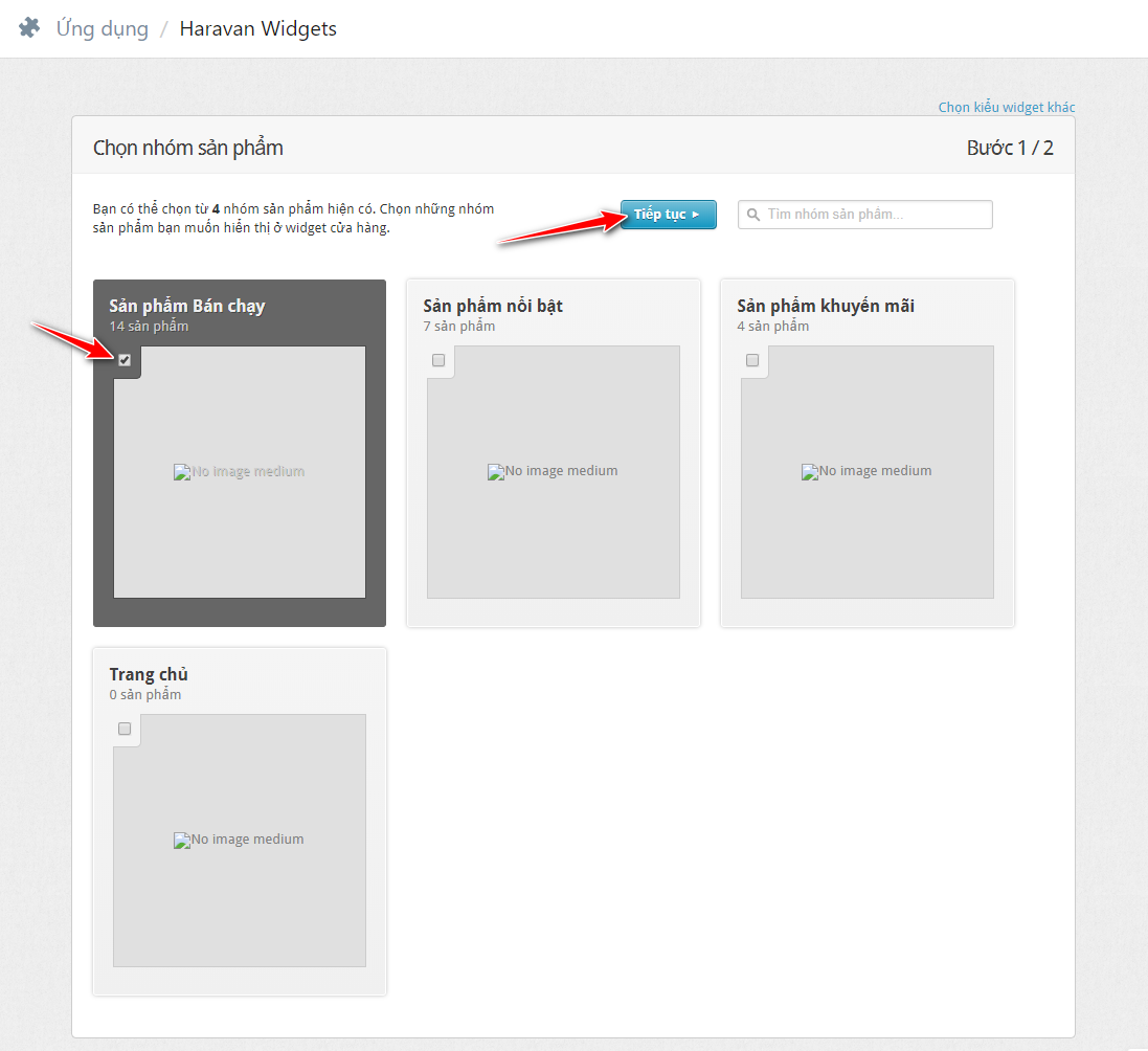 Trên trang ứng dụng Widgets, chọn Nhúng Nhóm sản phẩm.