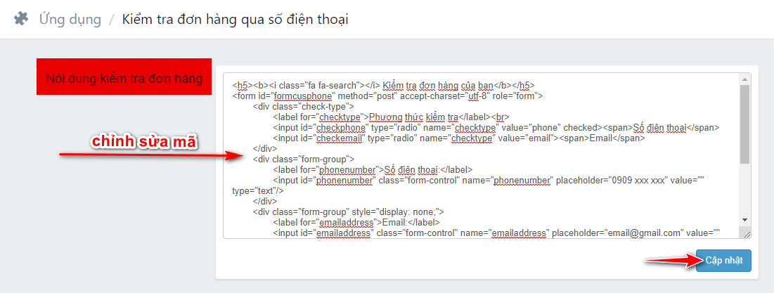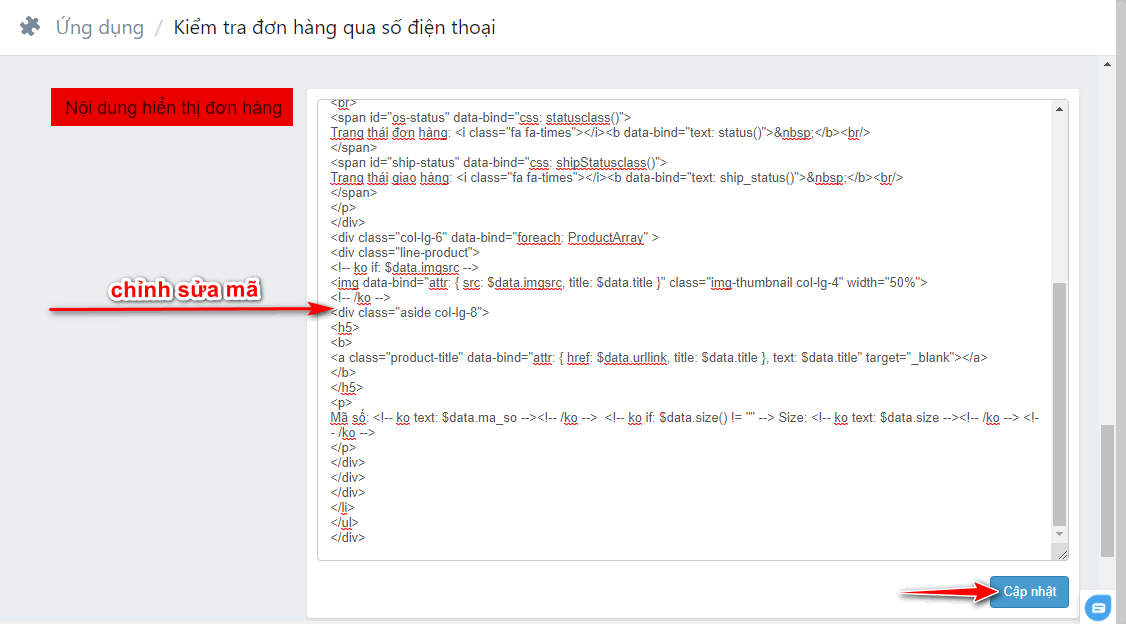 - Chỉnh sửa trong khung Nội dung hiển thị đơn hàng