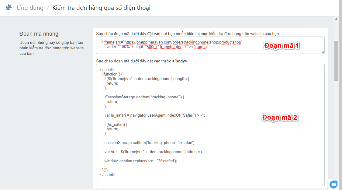 - Trong ứng dụng → vào mục Đoạn mã nhúng, sao chép 2 đoạn mã