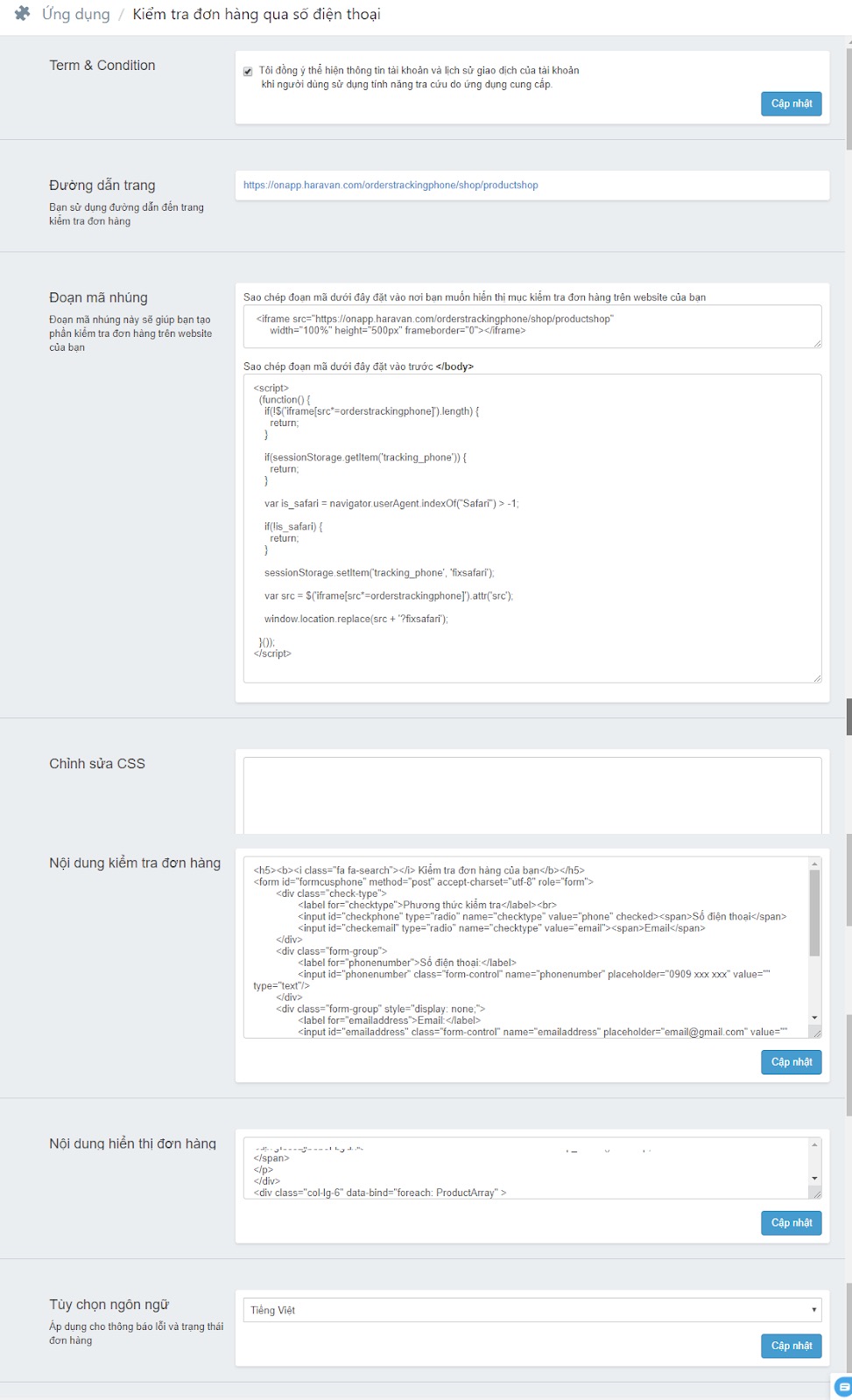 - Vào Trang quản trị → Ứng dụng → Kiểm tra đơn hàng qua số điện thoại