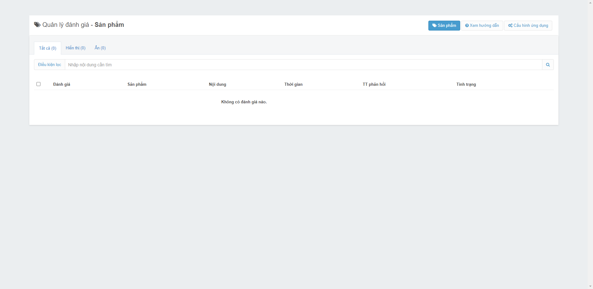 Để thực hiện cấu hình cho ứng dụng, người bán truy cập vào ứng dụng Product Reviews, chọn Cấu hình ứng dụng.
