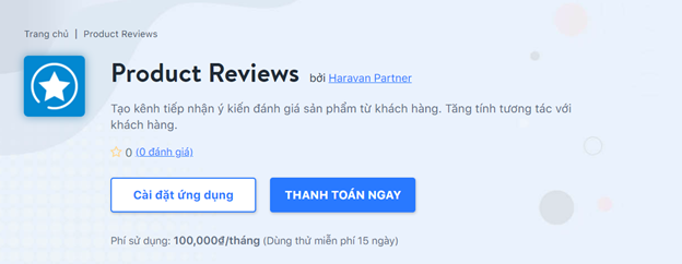 Ứng dụng Product Reviews do nhóm Haravan Partners phát triển, hỗ trợ người bán dùng thử 15 ngày, trước khi sử dụng chính thức với mức phí 100,000đ/tháng.