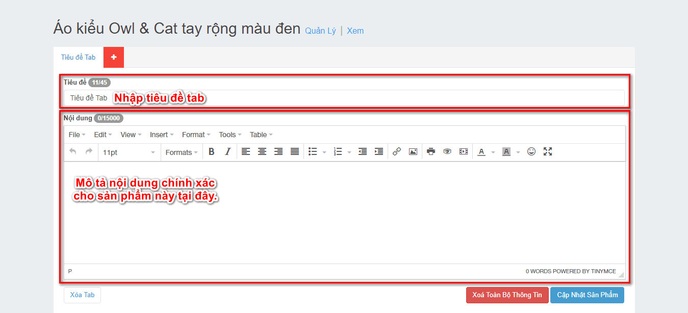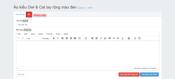 Khi cần thêm tab, người bán nhấp chọn vào biểu tượng dấu + màu đỏ. Sau đó, người bán nhập tiêu đề tab và nội dung mô tả, và chọn Cập nhật sản phẩm để hệ thống lưu lại.