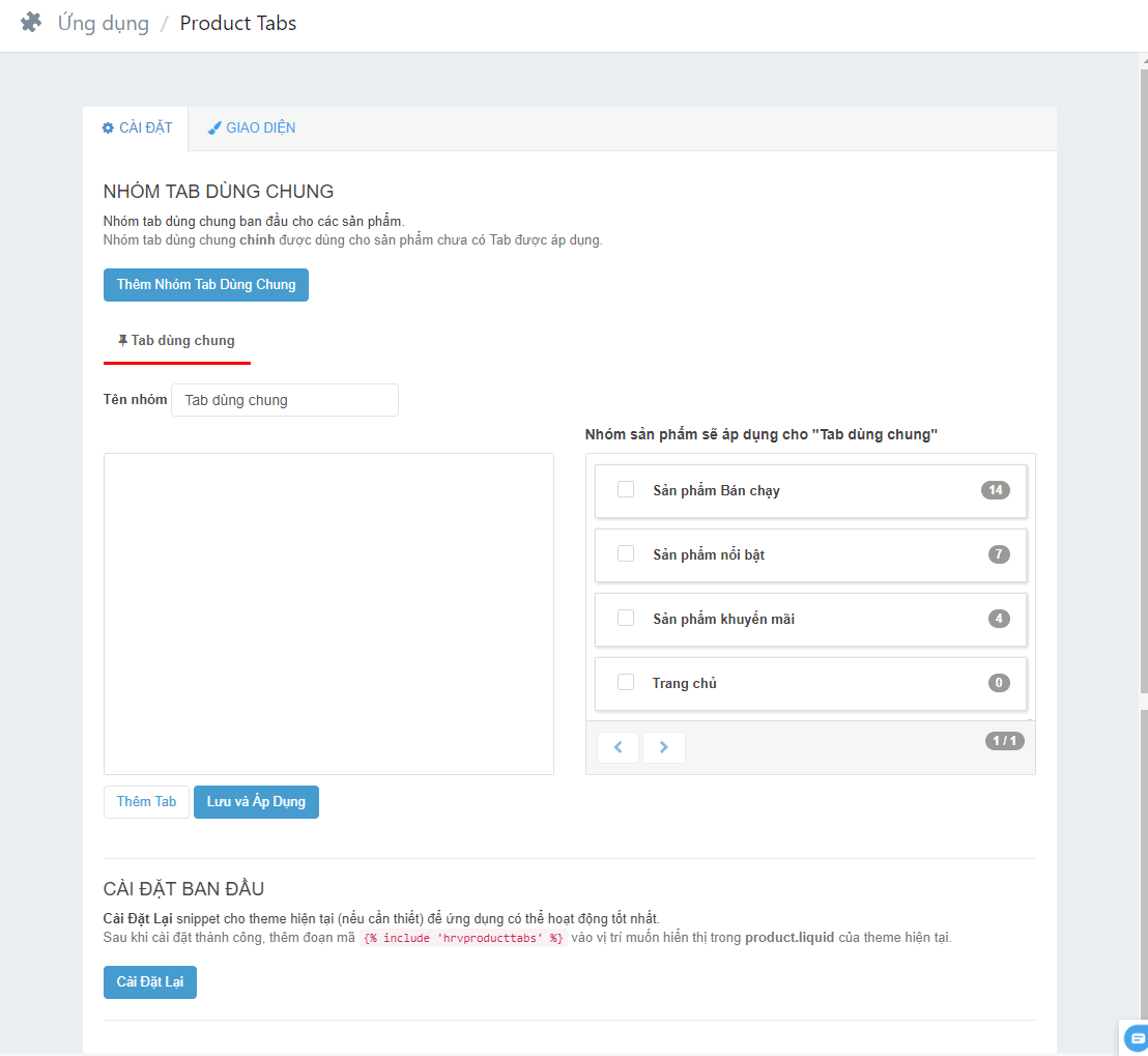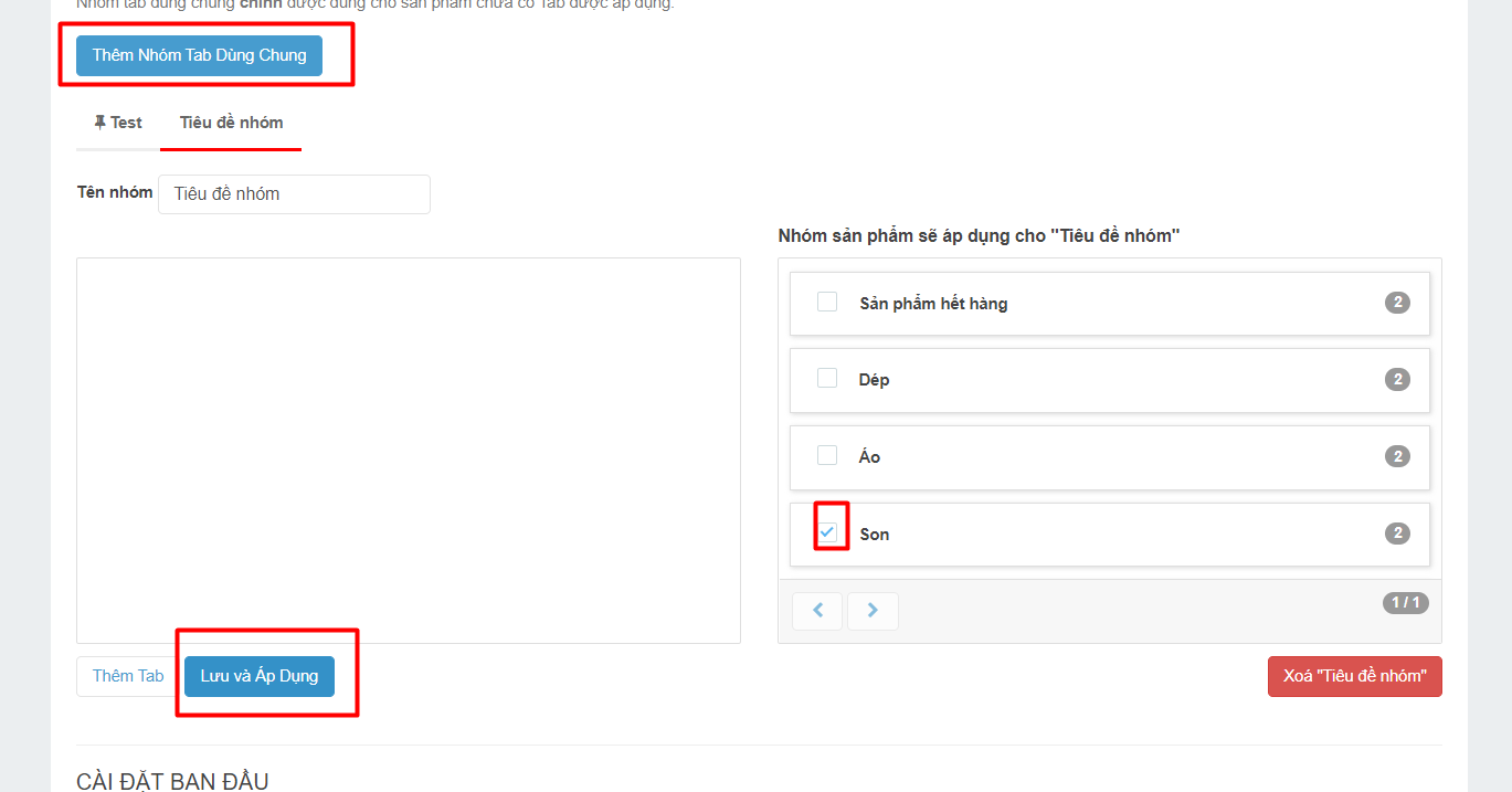 Ứng dụng không hỗ trợ xóa tab dùng chung và nội dung tab đã thiết lập cho nhóm sản phẩm.