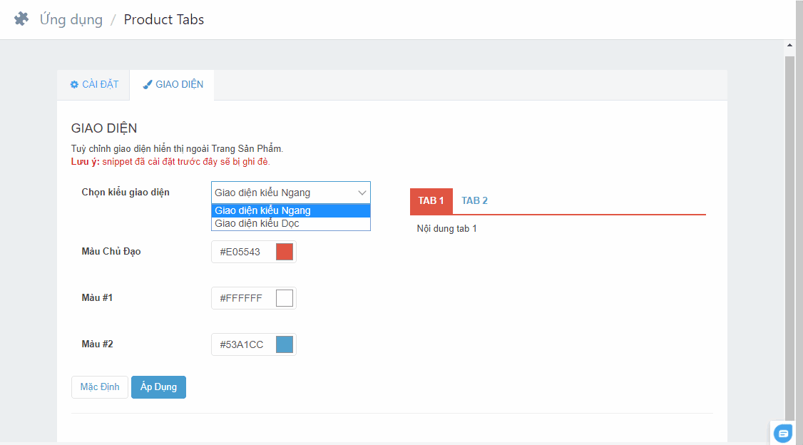 Từ Trang quản trị → Ứng dụng → Product Tabs.