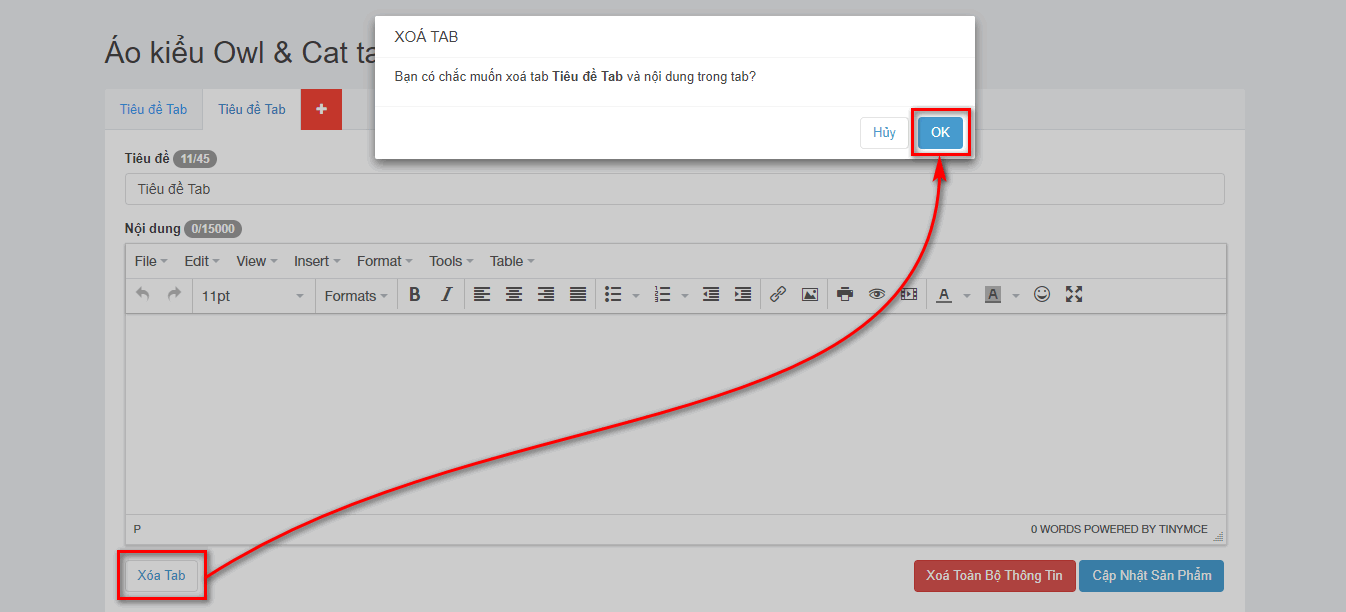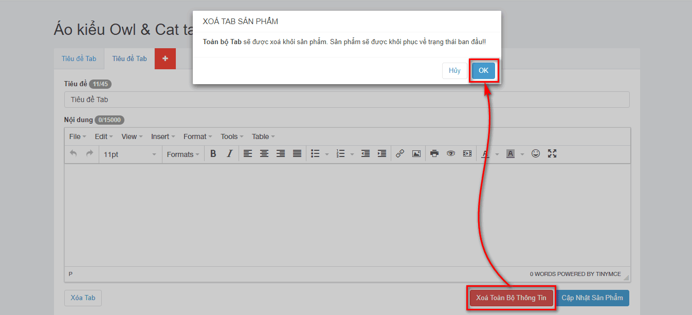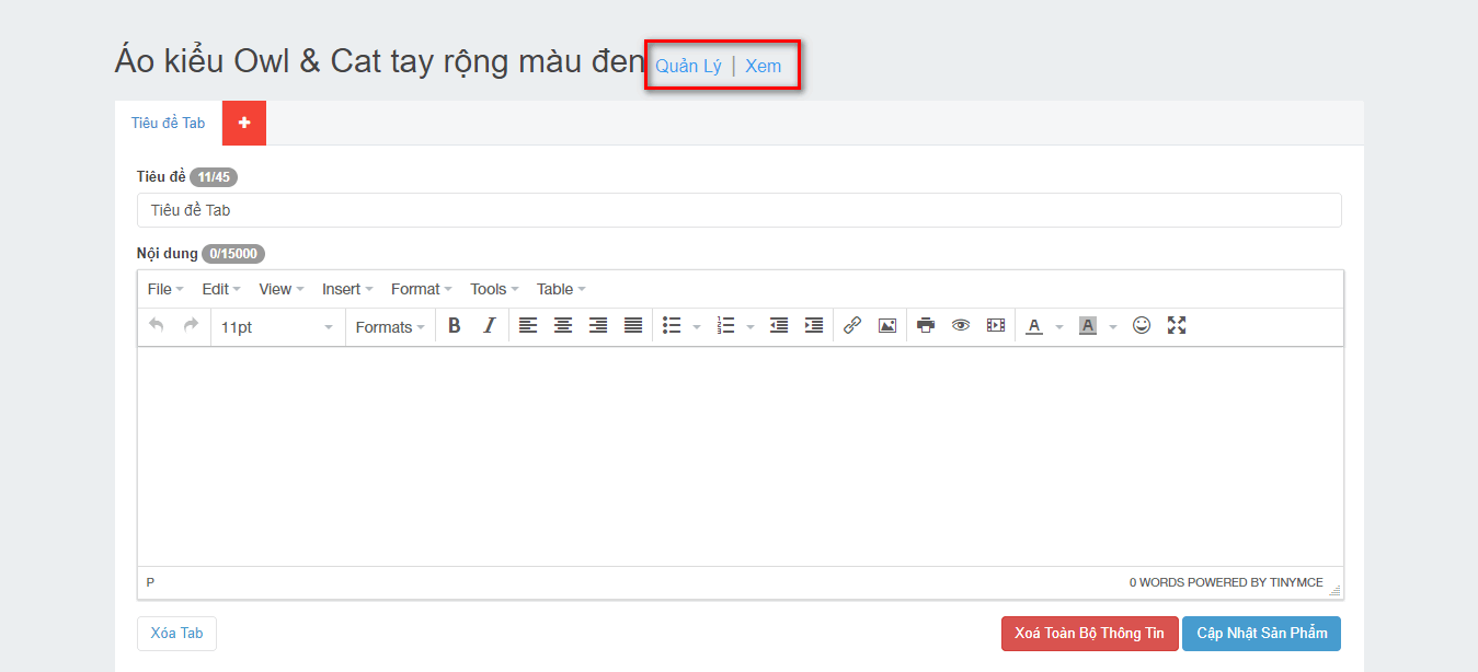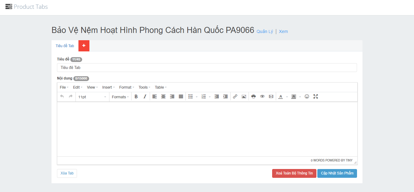 - Hệ thống điều hướng đến trang chỉnh sửa tabs nội dung cho sản phẩm đó.