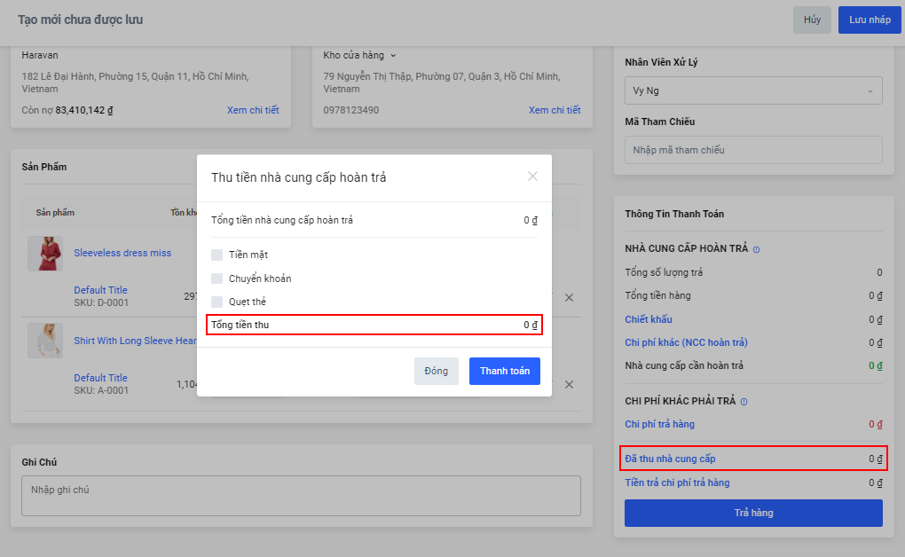 - Tạo phiếu thu đối tượng nộp là nhà cung cấp và chọn ghi nhận công nợ => Tăng nợ nhà bán hàng phải trả cho nhà cung cấp.