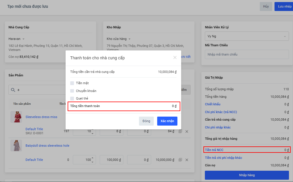 - Hoãn thanh toán chi phí mua hàng**(chưa nhập số tiền vào mục Đã thanh toán cho NCC trong phiếu nhập hàng)** => ghi nhận khoản phải trả => tăng nợ nhà bán hàng phải trả cho nhà cung cấp.