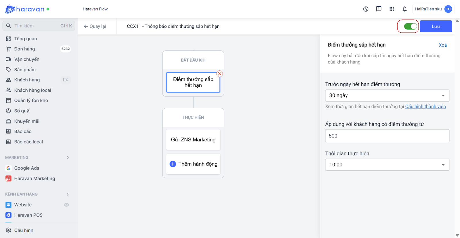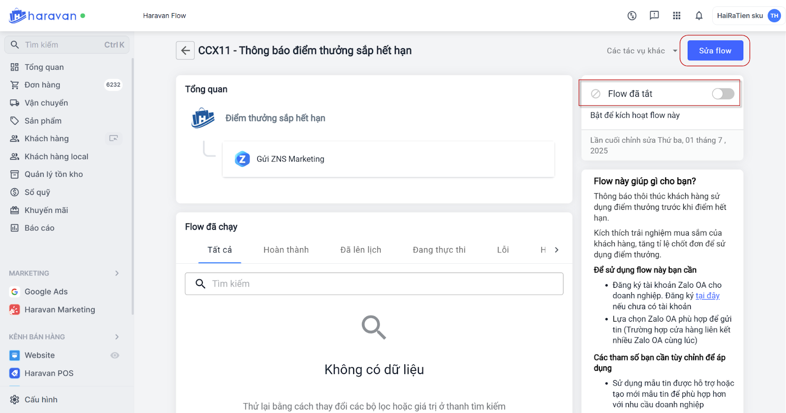 | Thông báo điểm thưởng sắp hết hạn | Gửi khi điểm thưởng sắp hết hạn. Hệ thống mặc định gửi thông báo trước 15 ngày điểm thưởng hết hạn, áp dụng cho khách có từ 500 điểm trở lên. Bạn có thể chọn Sửa Flow và chỉnh lại điều kiện gửi. Chỉnh sửa điều kiện gửi flow |