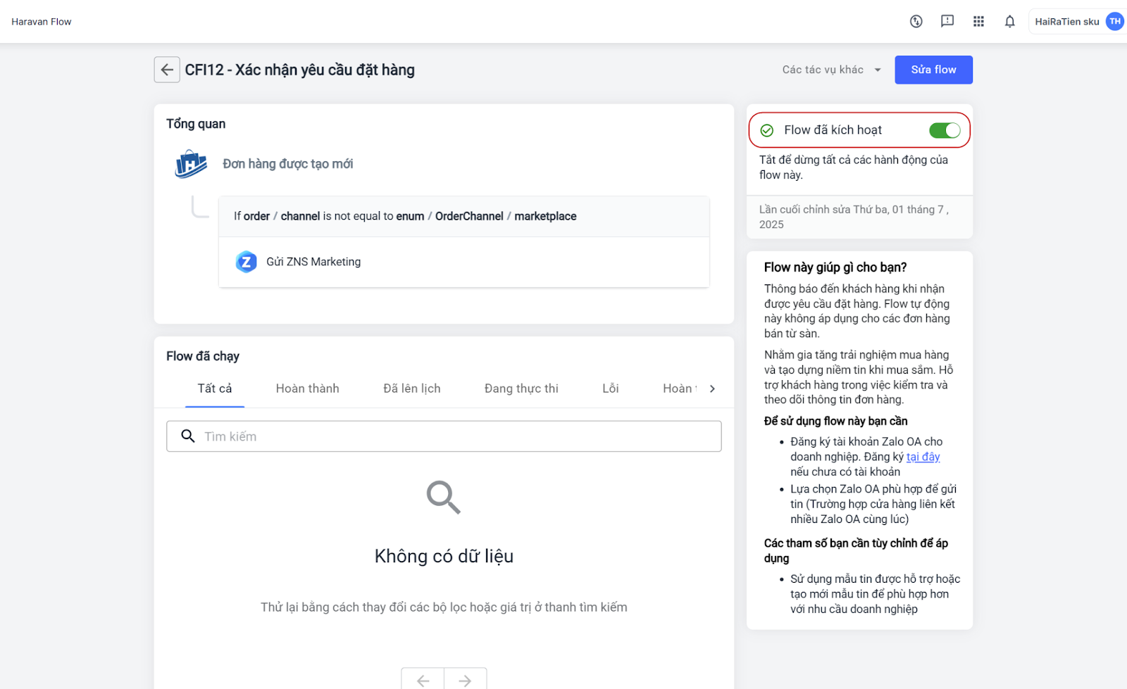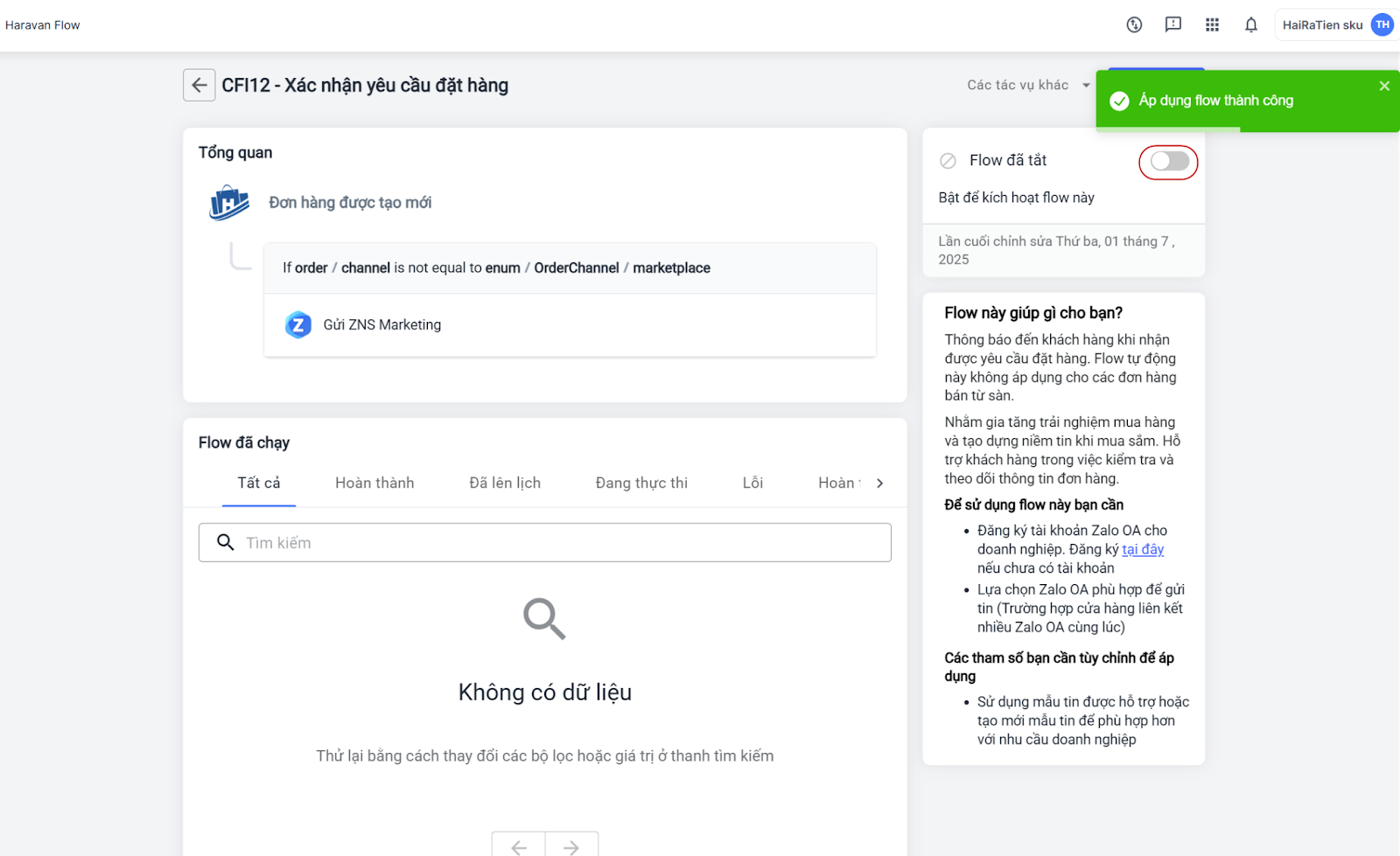 Nếu bạn đã kết nối sẵn Zalo OA, hệ thống sẽ báo áp dụng flow thành công và bạn chỉ cần bật nút kích hoạt Flow để bắt đầu chạy tin nhắn tự động.