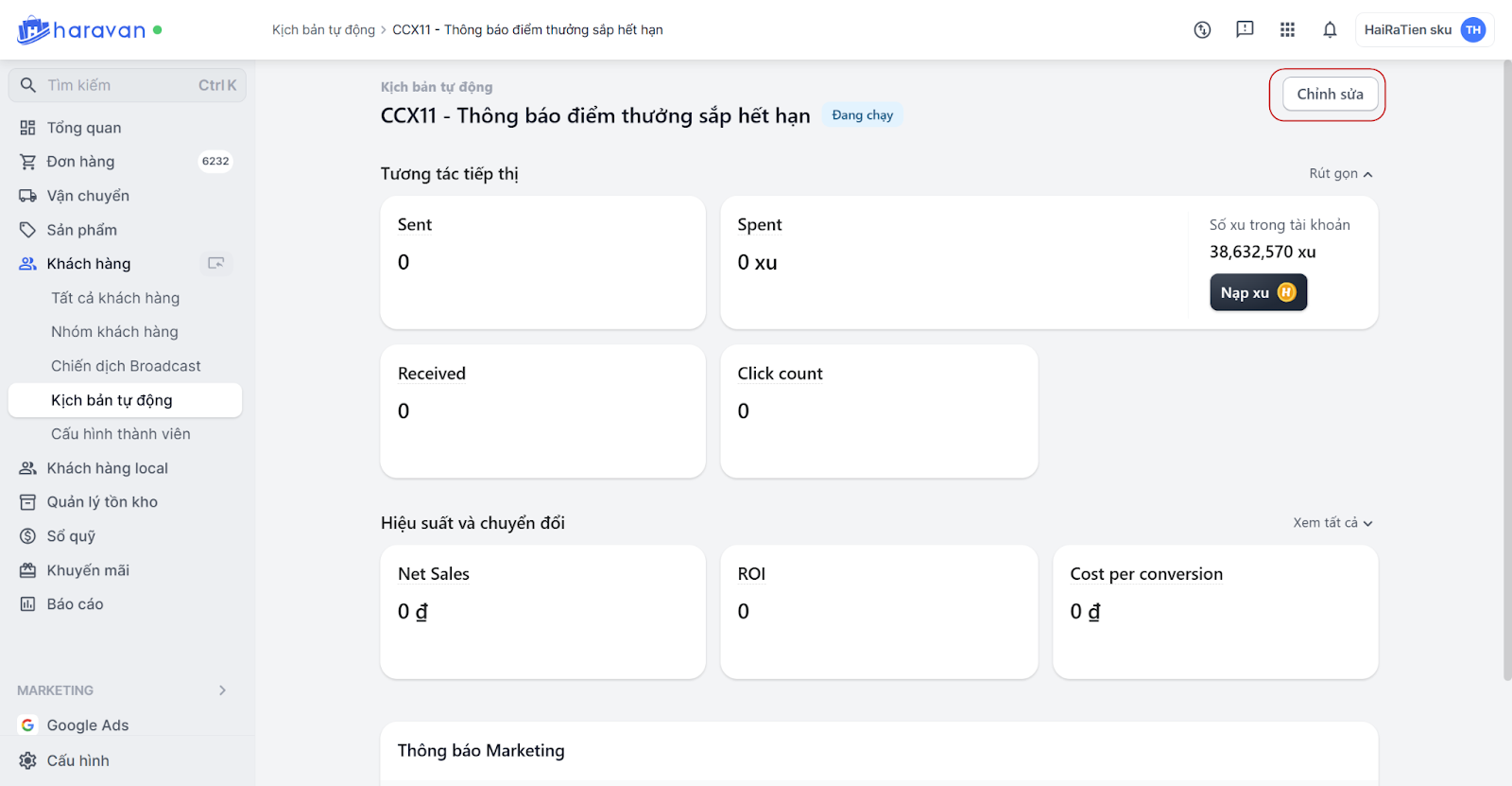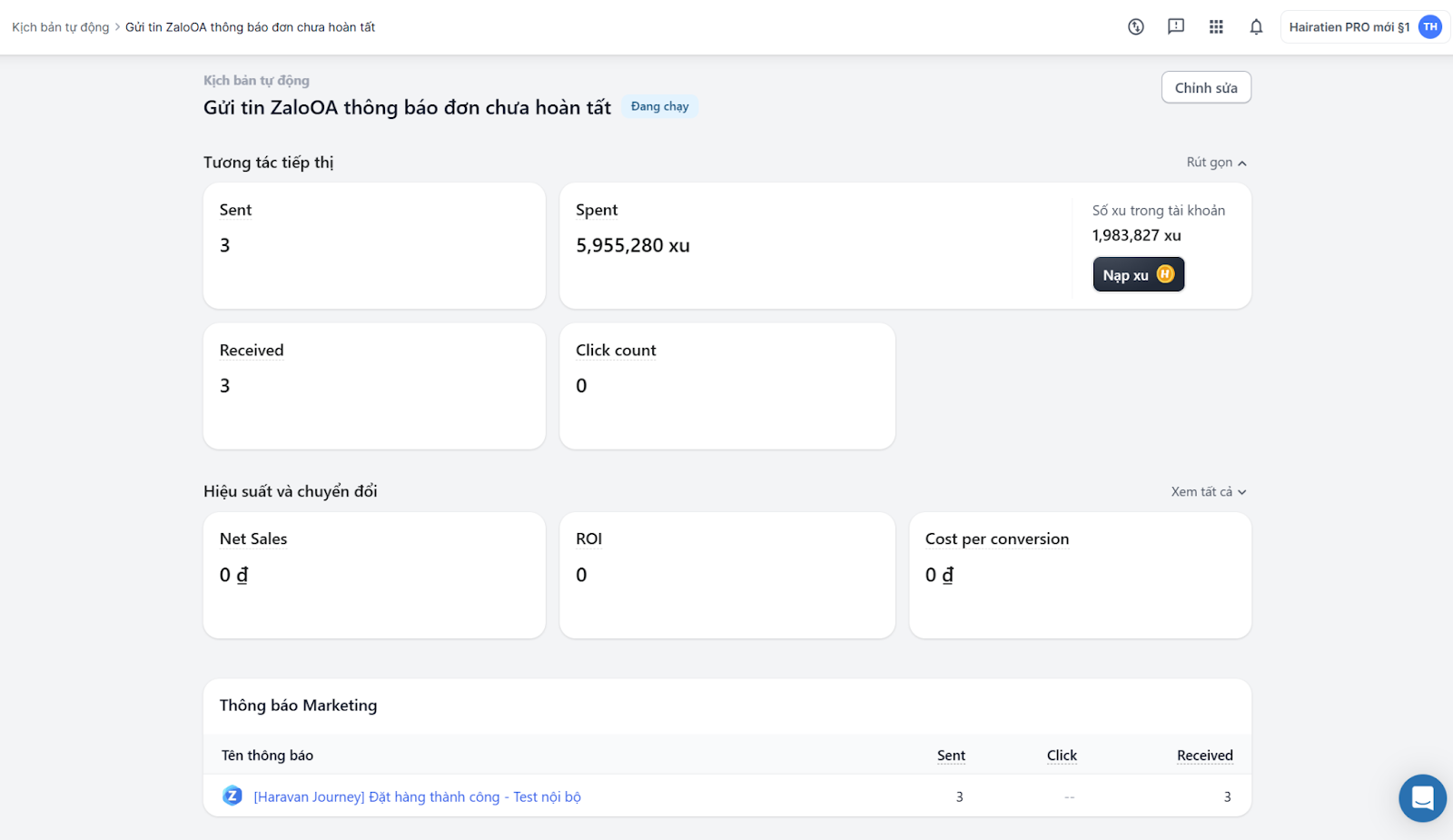 * Chi phí gửi tin nhắn ZNS voucher là 650 xu và 500 xu cho các loại tin ZNS khác. Mức giá có thể thay đổi tùy theo chính sách cập nhật từ Zalo. Bạn cần nạp xu vào trang quản trị MyHaravan và hệ thống tự trừ trên lượng xu đã nạp. Xem hướng dẫn nạp xu tại đây