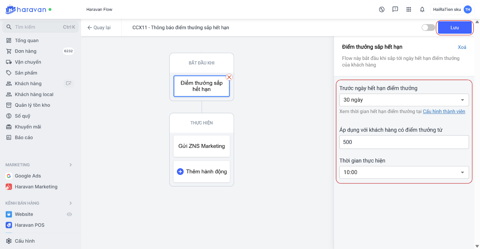 - Chỉnh sửa điều kiện gửi tin và chọn Lưu