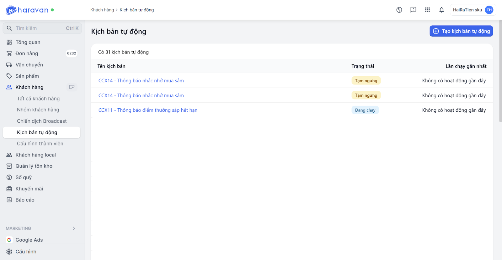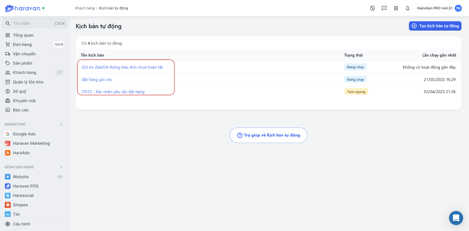Tại mục Khách hàng, bạn chọn Marketing Automation. Sau đó, bạn chọn Tạo kịch bản tự động và chọn kịch bản muốn triển khai.